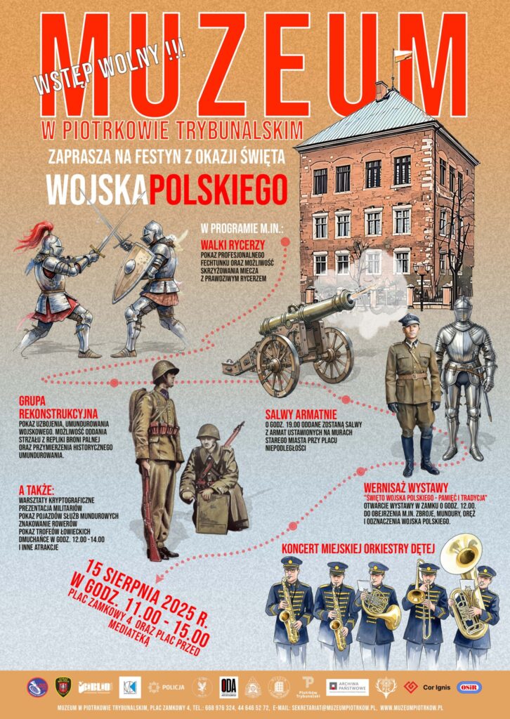 Tuż po oficjalnych uroczystościach warto wybrać się na plac Zamkowy i plac przed Mediateką – tam odbędzie się festyn z okazji święta Wojska Polskiego. Muzeum w Piotrkowie Trybunalskim przeniesie nas w świat rycerzy, żołnierzy i oręża! Wśród wielu atrakcji będą: walki rycerzy, rekonstrukcje historyczne – broń, mundury, repliki, salwy armatnie na murach starego miasta (godz. 19). Zaplanowano także wernisaż wystawy pt. „Święto Wojska Polskiego – pamięć i tradycja” (godz. 12, sala II p. w zamku) i koncert Miejskiej Orkiestry Dętej.