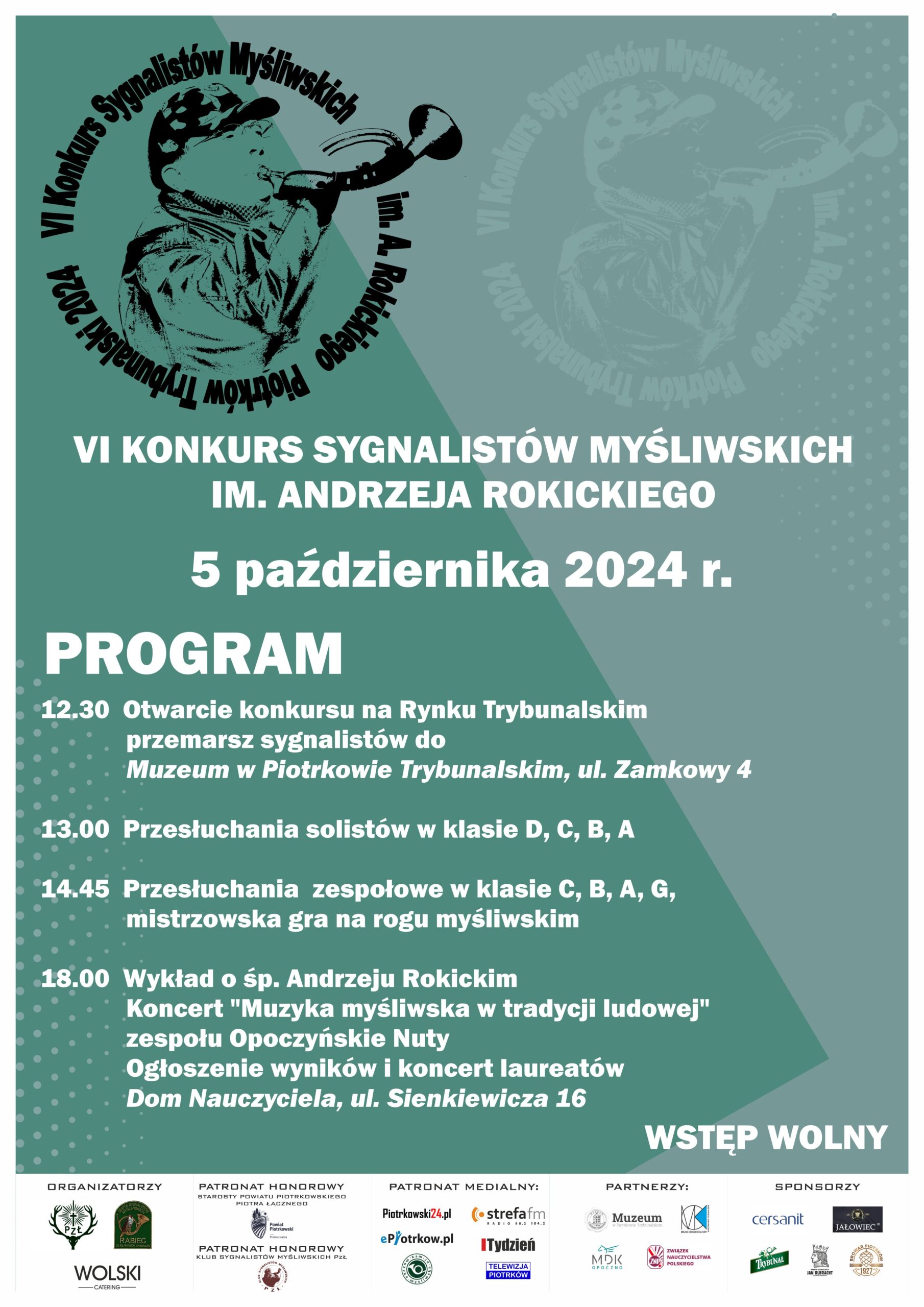 Zarząd Okręgowy Polskiego Związku Łowieckiego w Piotrkowie Trybunalskim, Zespół Sygnalistów Myśliwskich RABIEC oraz Wolski Catering zapraszają na VI Konkurs Sygnalistów Myśliwskich im. Andrzeja Rokickiego. Patronat honorowy nad konkursem objął starosta Piotr Łączny oraz Klub Sygnalistów Myśliwskich PZŁ. Partnerami wydarzenia są: Muzeum w Piotrkowie Trybunalskim, Miejskie Ośrodek Kultury w Piotrkowie Trybunalskim, Miejski Dom Kultury im. T. Sygietyńskiego w Opocznie oraz Związek Nauczycielstwa Polskiego w Piotrkowie Trybunalskim. Na finał konkursu w koncercie „Muzyka myśliwska w tradycji ludowej” wystąpi zespół ludowy Opoczyńskie Nuty!