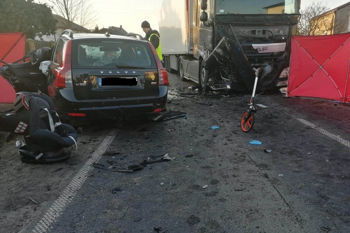 – Ze wstępnych ustaleń policjantów wynika, że 34-letnia mieszkanka Skierniewic kierująca volvo V50 z niewyjaśnionych przyczyn zjechała na przeciwległy pas ruchu gdzie zderzyła się z samochodem ciężarowym DAF z naczepą kierowanym przez 37-letniego mężczyznę. Na skutek odniesionych obrażeń kierująca volvo poniosła śmierć na miejscu. Kobieta przewoziła dwóch synów w wieku 2 i 7 lat. 2-latek zginął na miejscu. 7-latek w stanie ciężkim został przetransportowany śmigłowcem LPR do szpitala. Kierujący ciężarówką był trzeźwy. Na miejscu wypadku pracowali policjanci pod nadzorem prokuratora. – informuje Radosław Gwis z Komendy Wojewódzkiej Policji w Łodzi.