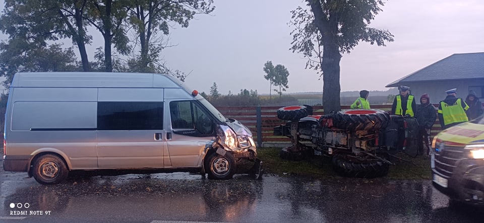 Kierujący ciągnikiem rolniczym trafił do szpitala po zderzeniu z busem. Ze wstępnych ustaleń policji wynika, że kierujący traktorem zaczął skręcać w czasie kiedy kierowca transportera rozpoczął manewr wyprzedzania. Po zderzeniu ciągnik przewrócił się i uderzył w drzewo.