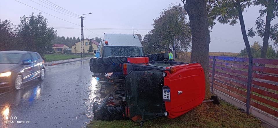 Do wypadku doszło w środę rano w Jeżowie w gminie Wola Krzysztoporska. – Zgłoszenie do dyżurnego policji wpłynęło o 7:17. Ze wstępnych ustaleń wynika, że kierowca ciągnika jechał od strony A1 w stronę Rozprzy. Chcąc wykonać manewr skrętu w lewo w drogę nieutwardzoną, nie spojrzał w lusterko i nie zauważył pojazdu który w tym czasie rozpoczął już manewr wyprzedzania. W wyniku tego doszło do zderzenia obu pojazdów. Ciągnik przewrócił się i dodatkowo zahaczył przydrożne drzewo. Kierujący maszyną rolniczą karetką pogotowia został przewieziony do szpitala. – powiedziała e rozmowie z nami st. asp.Izabela Gajewska z piotrkowskiej policji.