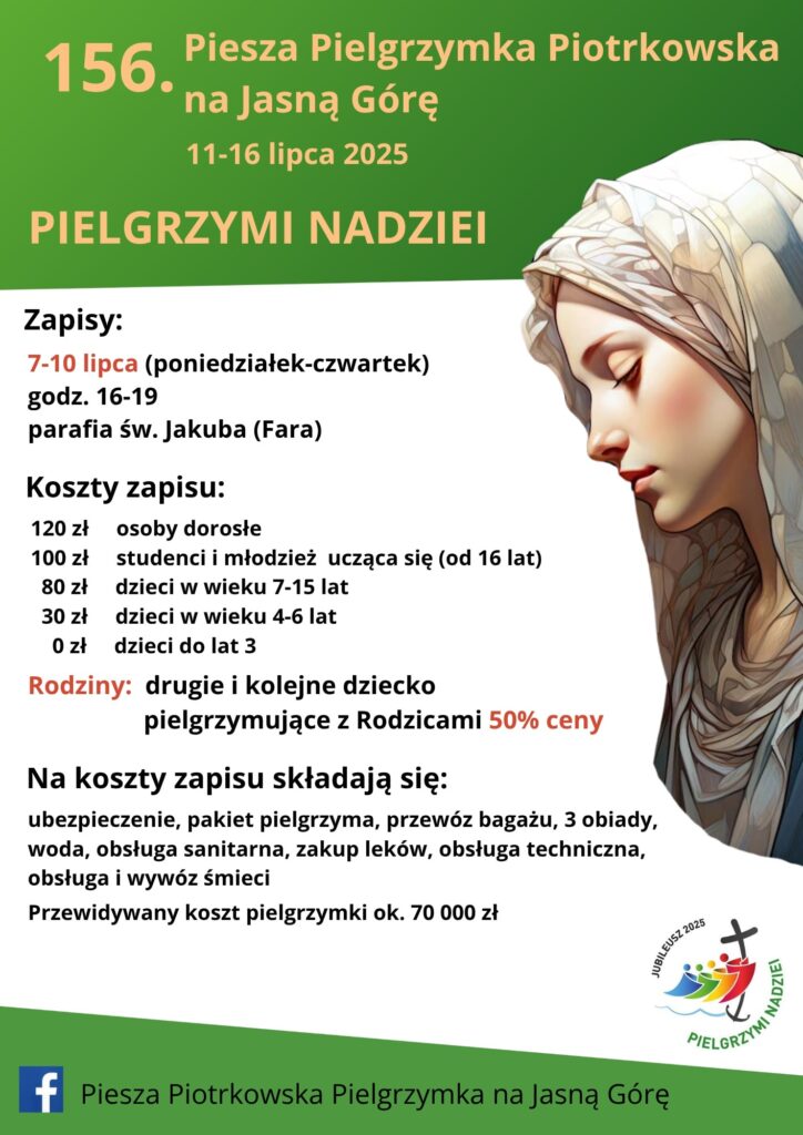 Zapisy dla wszystkich chętnych możliwe są jeszcze tylko dziś. Osoby zainteresowane udziałem w pielgrzymce mogą zgłaszać się w godzinach od 16:00 do 19:00 w salce katechetycznej kościoła św. Jakuba Apostoła.