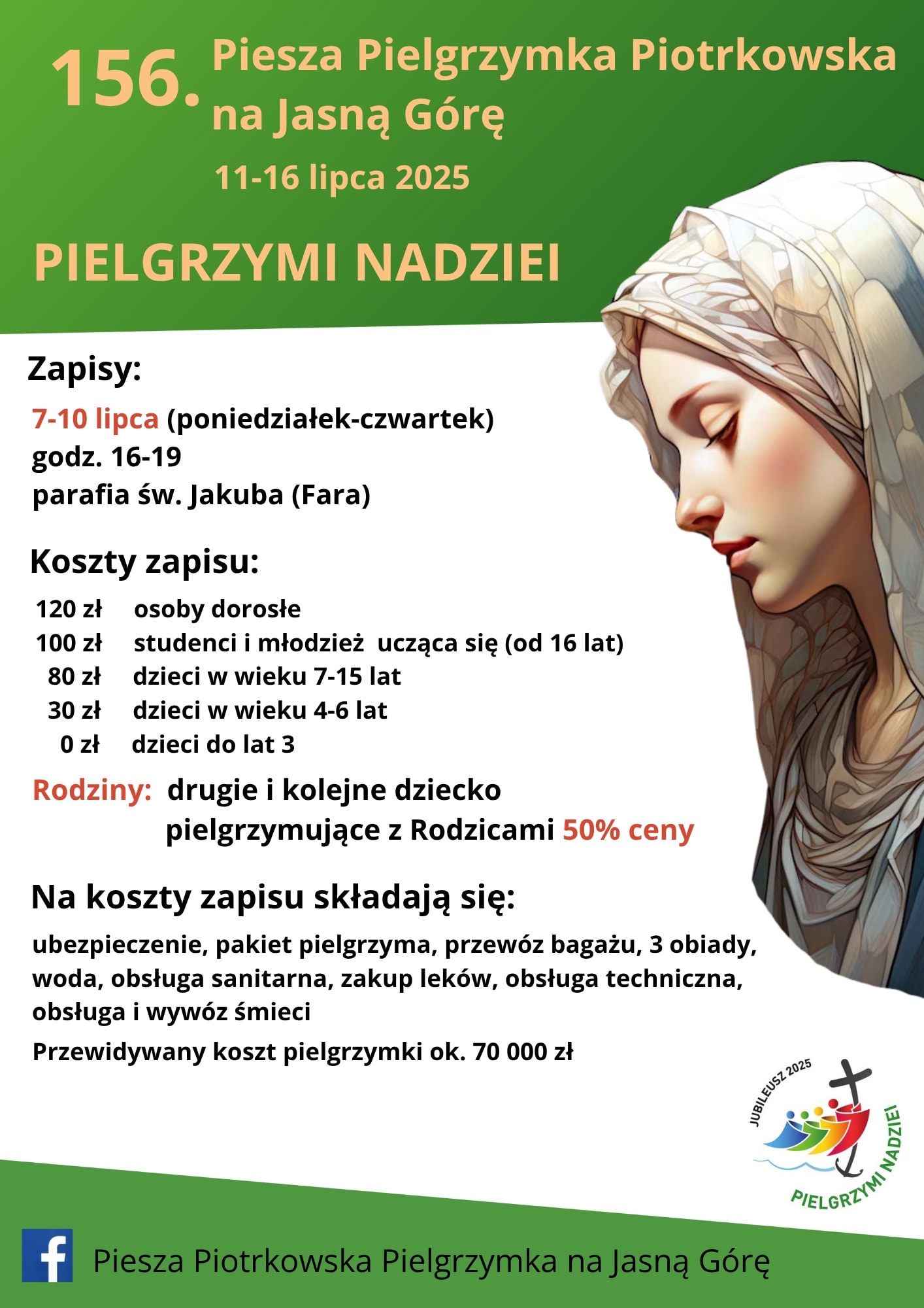 - Drugie i kolejne dzieci z tej samej rodziny, pielgrzymujące z rodzicami – płacą połowę ceny.