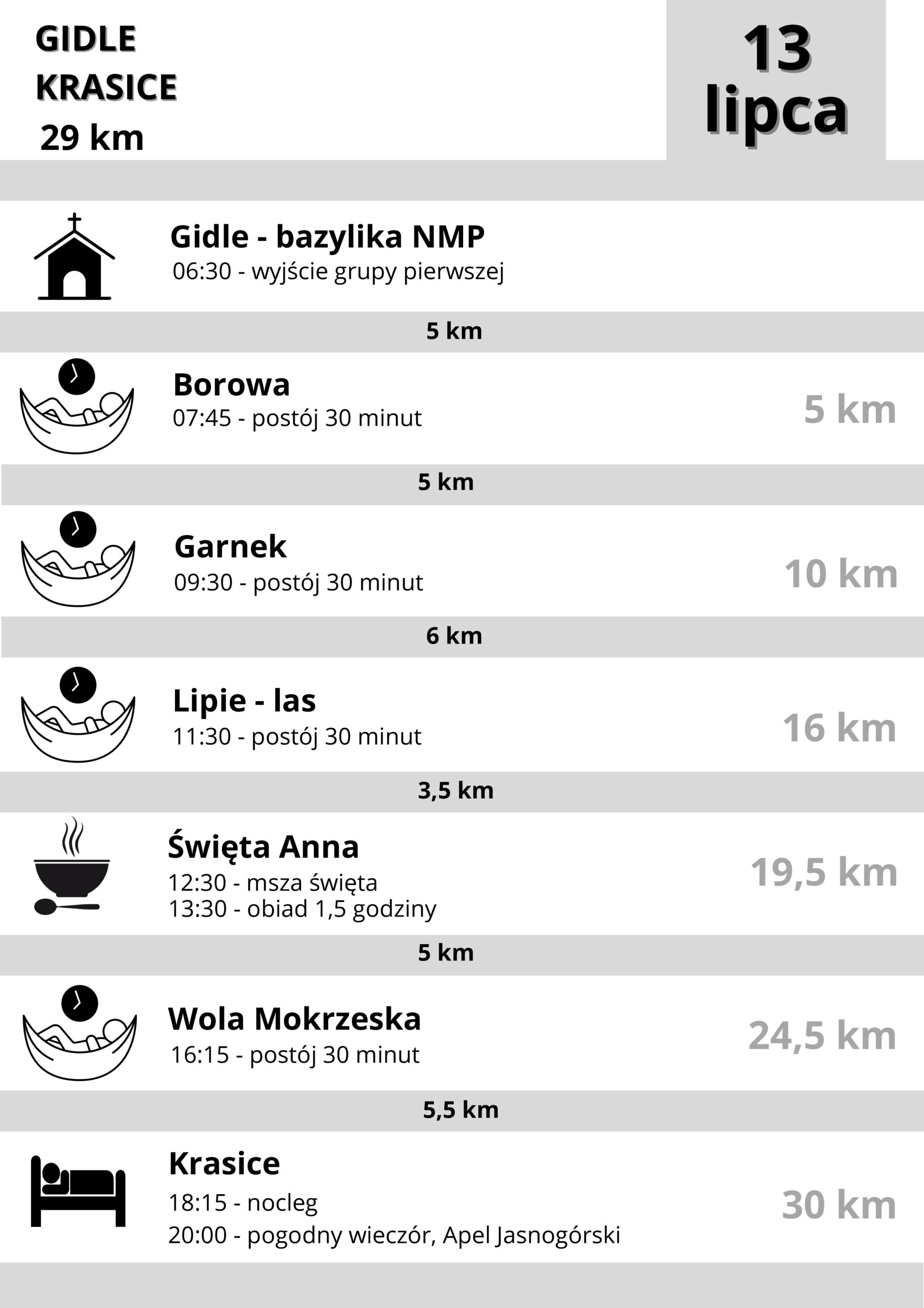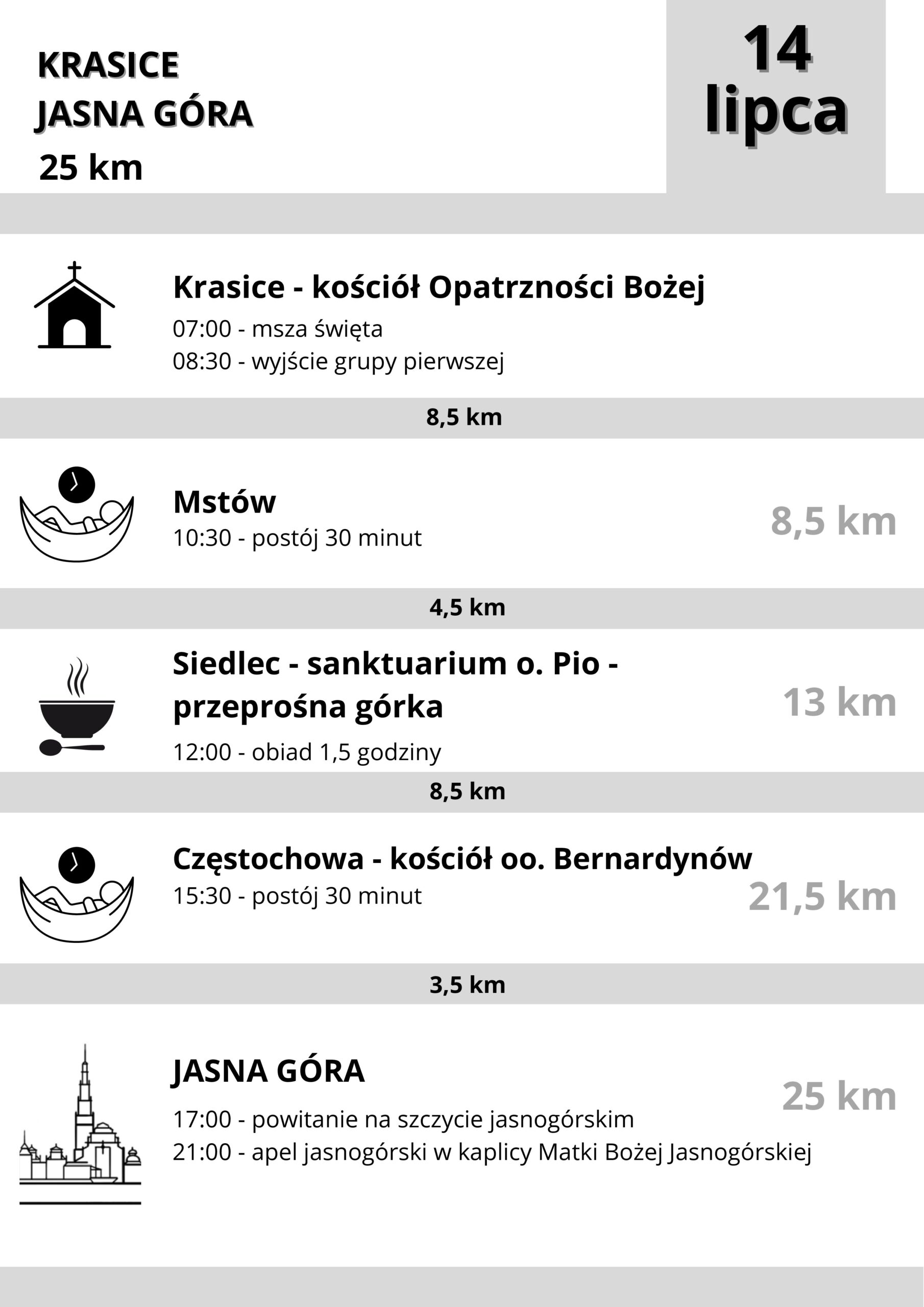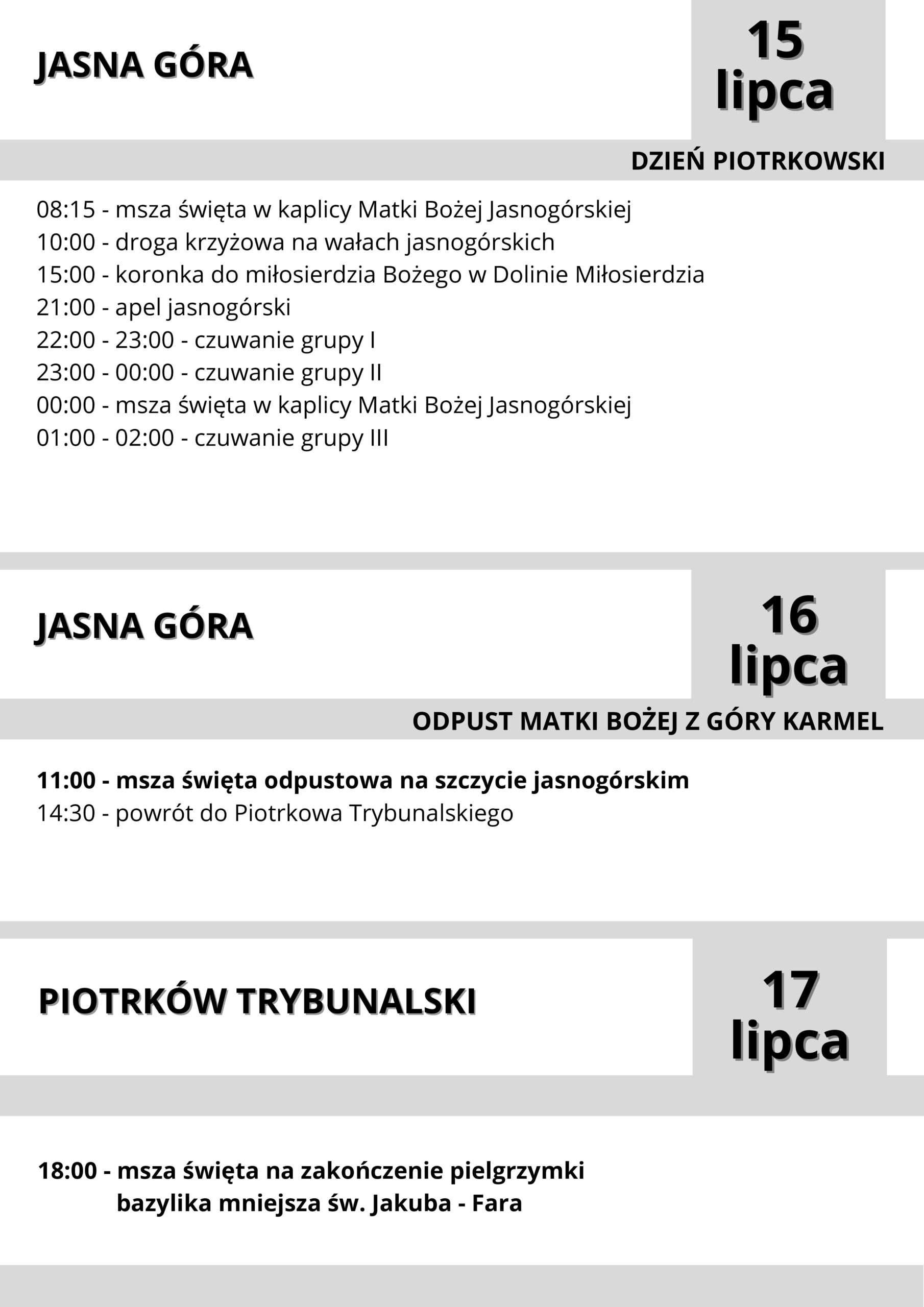 Pielgrzymi, pod hasłem „Pielgrzymi nadziei”, wyruszą w drogę do Częstochowy w piątek, 11 lipca, po porannej mszy świętej, która zostanie odprawiona w kościele farnym. Ich celem jest dotarcie na Jasną Górę na święto Matki Bożej z Góry Karmel, czyli Szkaplerznej, które przypada 16 lipca.