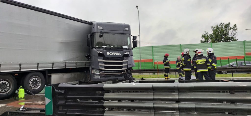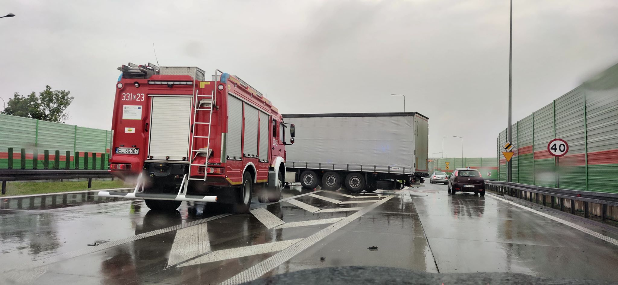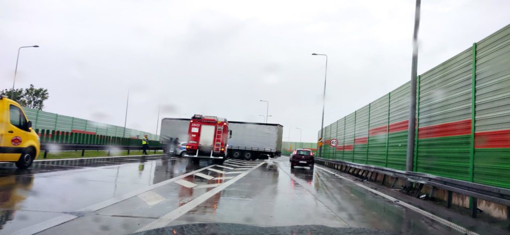 Na S8 tuż przed Polichnem ciężarowa scania zderzyła się z bmw. W wyniku kolizji kierowca TIRa stracił panowanie nad pojazdem, wpadł w poślizg i stanął w poprzek drogi, blokując dwa z trzech pasów ruchu w kierunku stolicy. Ruch odbywa się tylko pasem awaryjnym. Straż pożarna neutralizowała płyny eksploatacyjne które wylały się z pojazdów.