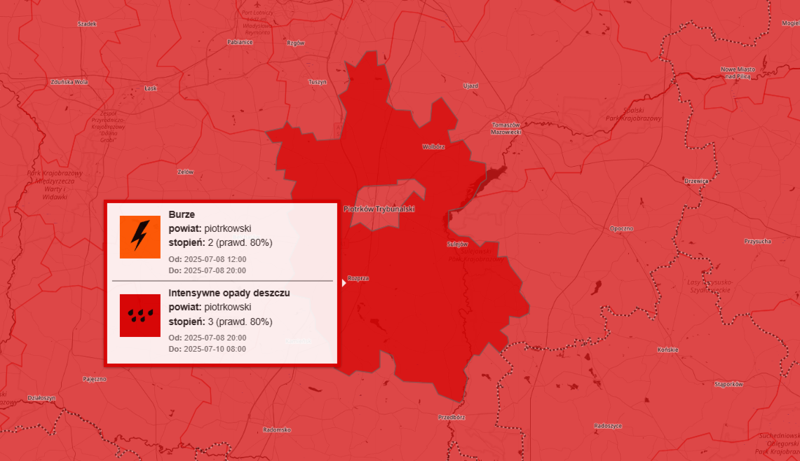 - Ostrzeżenie II stopnia (pomarańczowe) przed burzami: Dotyczy m.in. Piotrkowa Trybunalskiego oraz powiatu piotrkowskiego. Prognozowane są burze, którym miejscami będą towarzyszyć bardzo silne opady deszczu od 30 mm do 40 mm oraz porywy wiatru do około 70 km/h. Lokalnie możliwy jest grad. Prawdopodobieństwo wystąpienia tych zjawisk wynosi 80%. Ostrzeżenie obowiązuje od godziny 12:00 we wtorek 8 lipca do godziny 20:00 tego samego dnia.