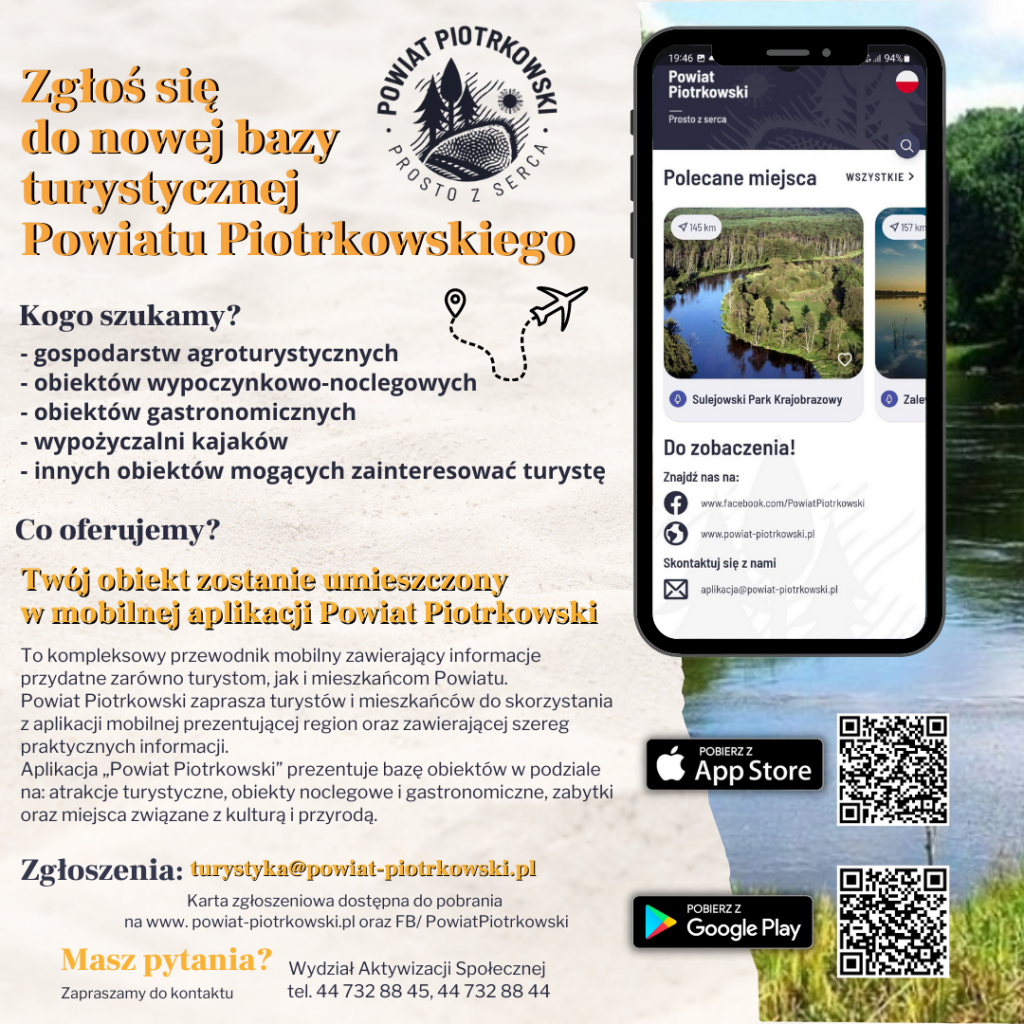Masz ciekawe miejsce, które warto zobaczyć, spędzić miło czas, coś dobrego zjeść lub przenocować – promuj je dzięki aplikacji turystycznej Powiatu Piotrkowskiego. Wystarczy wysłać zgłoszenie, które znajduje się poniżej, a o Twojej działalności niebawem dowiedzą się inni – zachęca piotrkowskie starostwo. Kto jeszcze nie ma aplikacji może zeskanować kod QR, by pobrać ją za darmo i zainstalować na swoim smartfonie czy tablecie.