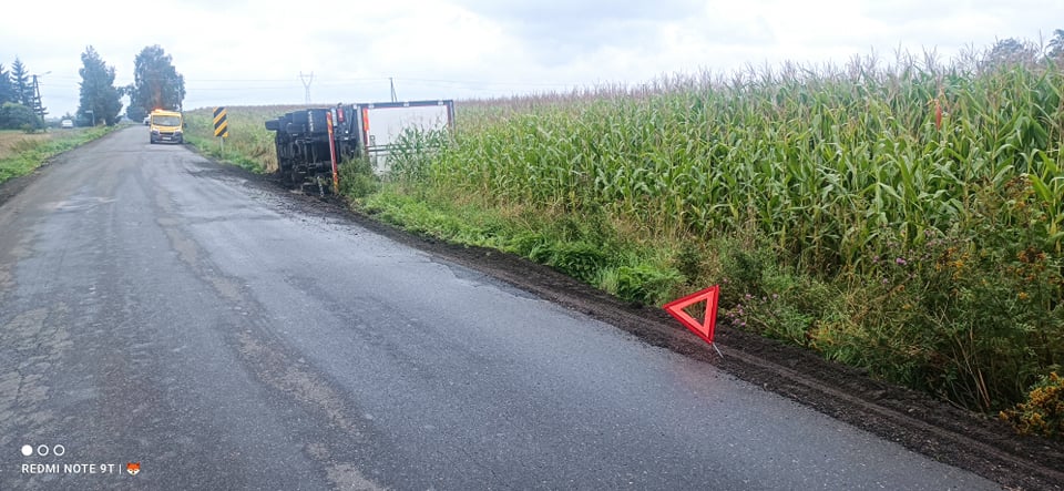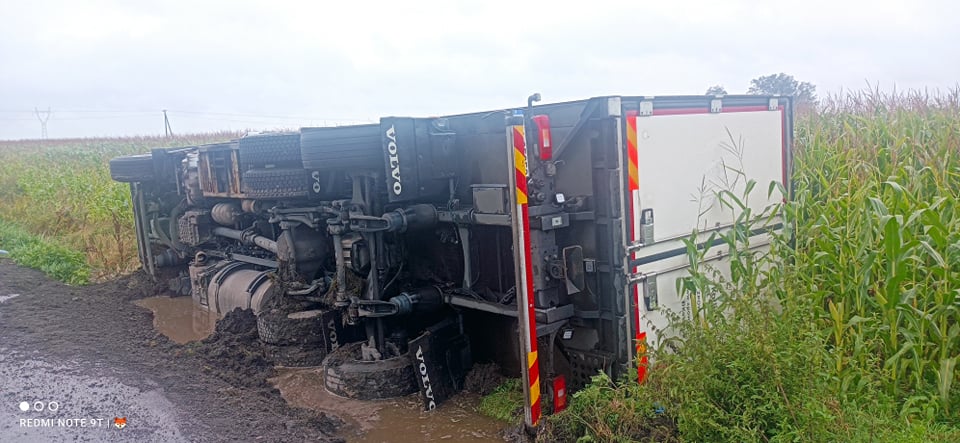 Sporo pracy będą mieli drogowcy podczas wyciągania z pola kukurydzy ciężarowego volvo, które przewróciło się w środę rano. Według relacji kierowcy volvo, ciężarówka przewróciła się na grząskim fragmencie pobocza podczas wymijania się z samochodem osobowym.