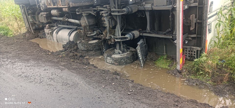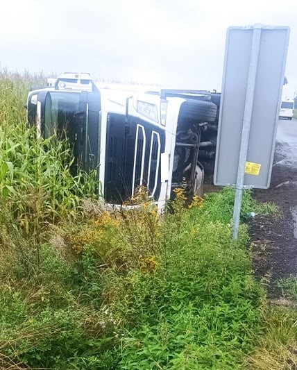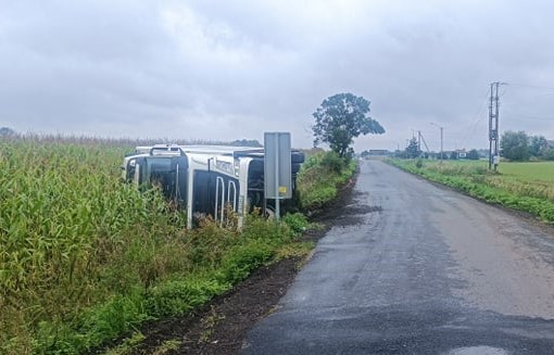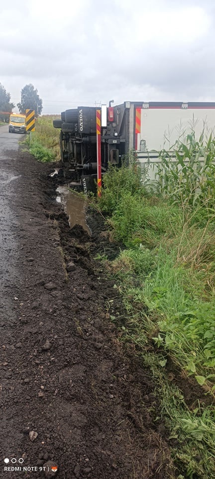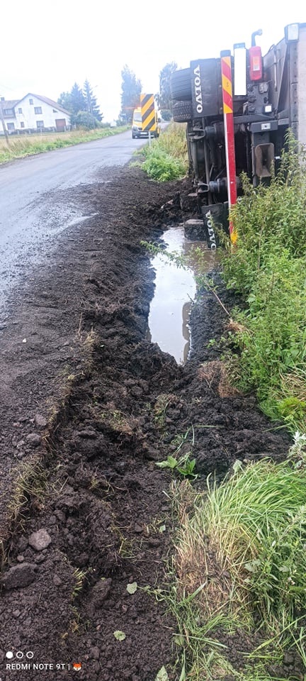 Do zdarzenia doszło podczas wymijania się dwóch pojazdów w okolicy Oprzężowa w gm. Wola Krzysztoporska. – Kierowca osobówki zatrzymał się na brzegu drogi i nie chciał jechać dalej. Postanowiłem że powoli pojadę. Zjechałem lekko na pobocze, ale okazało się że tam jest woda i błoto, i wtedy doszło do przewrócenia się mojego zestawu. – relacjonuje kierowca ciężarówki.
