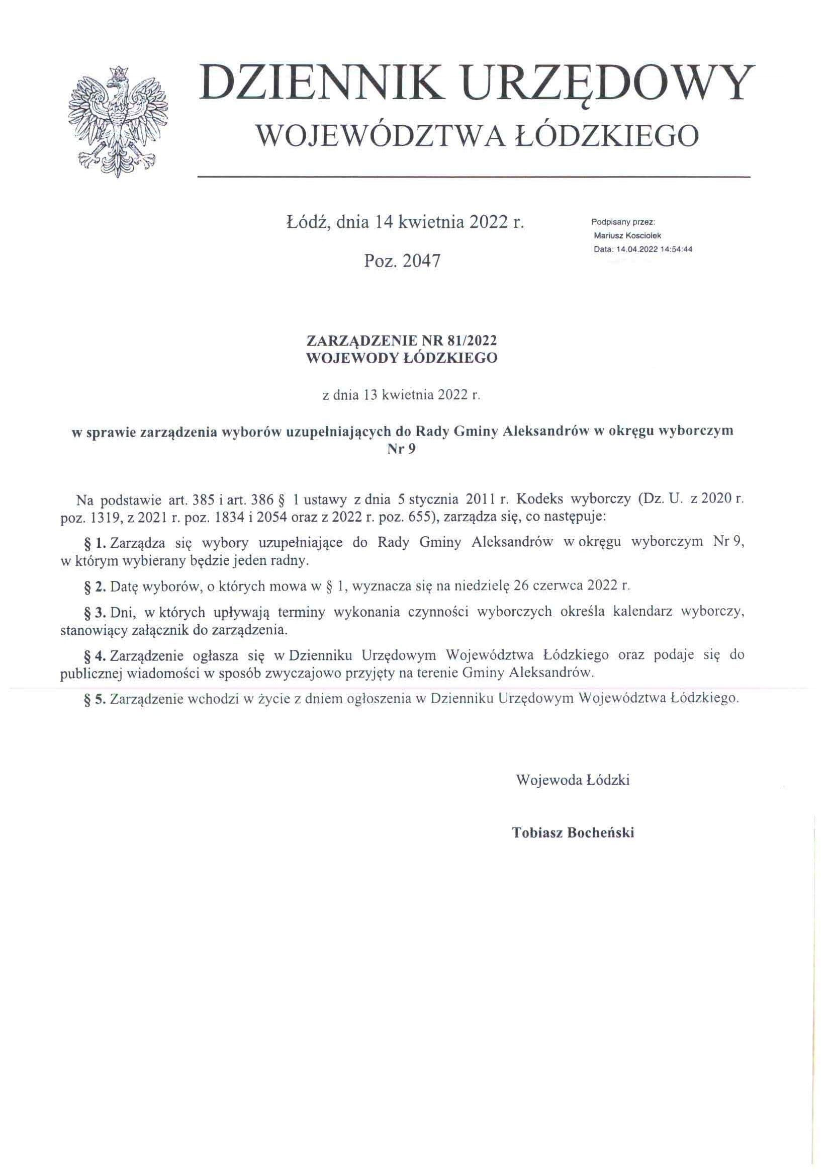 Jak już informowaliśmy, Daniel Jasion 1 kwietnia zrzekł się mandatu radnego Rady Gminy Aleksandrów, i objął funkcję Zastępcy Wójta – pisaliśmy o tym TUTAJ. Komisarz Wyborczy w tym dniu wygasił jego mandat, a wojewoda ogłosił właśnie wybory uzupełniające w okręgu z którego Jasion został wybrany. Zgodnie z zarządzeniem, odbędą się one 26 czerwca.