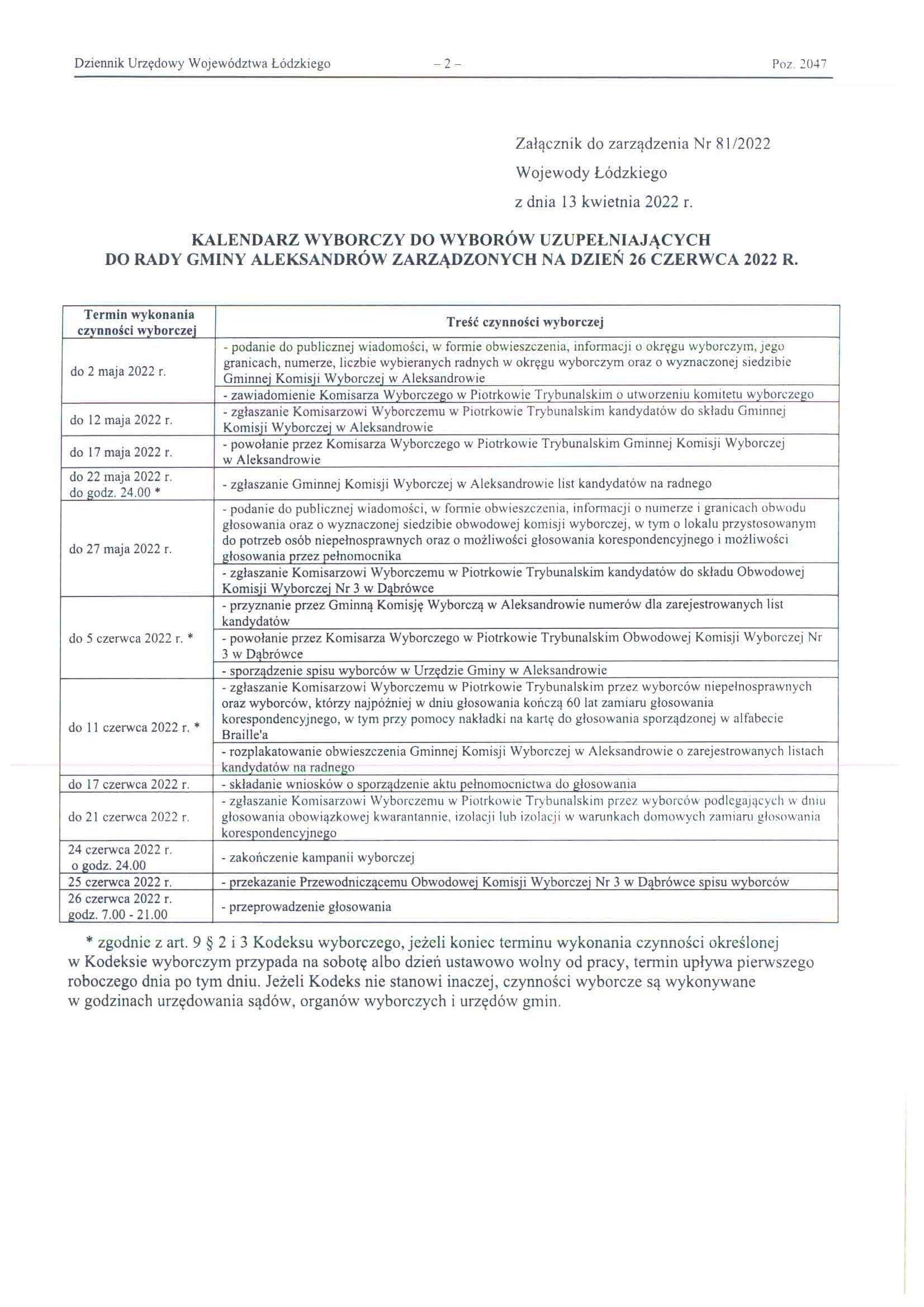 Na 26 czerwca zarządzono wybory uzupełniające w okręgu wyborczym nr 9. w gminie Aleksandrów. W związku z objęciem funkcji zastępcy wójta przez jednego z radnych, potrzebne jest uzupełnienie składu Rady Gminy.