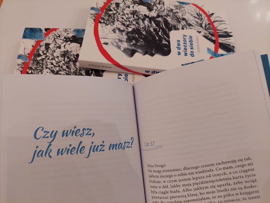 – Spełniły się moje marzenia. Po dwóch latach nierównej walki, wreszcie dotknęłam swoją książkę. Co czuję? Jestem wzruszona. Myślałam, że kiedy ta książka w końcu będzie, to ja poczuję taką ulgę, i powiem sobie: „teraz mogę spokojnie umierać”, bo są tu zapisane moje myśli, moje refleksje którymi chciałam się podzielić ze światem, chciałam by skorzystały z nich moje córki, moje przyjaciółki, moje znajome, koleżanki. Ale nie odczuwam czegoś takiego. Wprost przeciwnie. Obudziłam w sobie taką ogromną ciekawość. Co będzie dalej? Dokąd zaprowadzi mnie ta przygoda? Kogo poznam? Czy zmieni się moje życie? Czy po prostu, sprzedam ją i tyle? Nie bardzo jednak w to wierzę, bo już jest duże zainteresowanie tym wydawnictwem. Otwierają się nowe współprace i nowe możliwości. – mówi autorka. – To jest moment na który czekałam dwa lata. Prawdę mówiąc, miałam chwile zwątpienia, ale z dziełem jest tak, jak mówił Stephen King: „Jak już coś zaczniesz, i mocno w to wierzysz, to nawet jak jest milion przeszkód, to nie możesz przestać”. I ja nie mogłam przestać pisać tej książki. Nie mogłam jej nie wydać, choć miałam już takie myśli, żeby zamienić ją na bloga, może na podcast. Bo kiedy kilkudziesięciu wydawców odmówiło mi wydania tej książki mówiąc, że jest dobra, ale ja jestem osobą totalnie nierozpoznawalną w internecie, więc ona się nie sprzeda – bo tylko książki celebrytów sprzedają się bez problemów – chciałam to porzucić, ale najzwyczajniej w świecie nie mogłam. Wciąż wierzyłam, że jest kilka osób, którym ta książka może pomóc, może zmienić ich życie, i ta świadomość pomogła mi przetrwać. To książka nieidealna, ale najlepsza jaką mogłam napisać. Nie czekałam aż ja się naprawię, aż się wszystkiego nauczę, tylko działam pomimo lęku i obaw. A dzisiaj nie wstydzę się jej pokazywać, nie wstydzę się o niej mówić. Nie boję się hejtu i bardzo się cieszę, że ukazała się drukiem, zwłaszcza, że sama ją sfinansowałam, dlatego zapraszam do księgarni, bo debet na koncie mam na Rów Mariański. – powiedziała z uśmiechem Jolanta Kopeć.