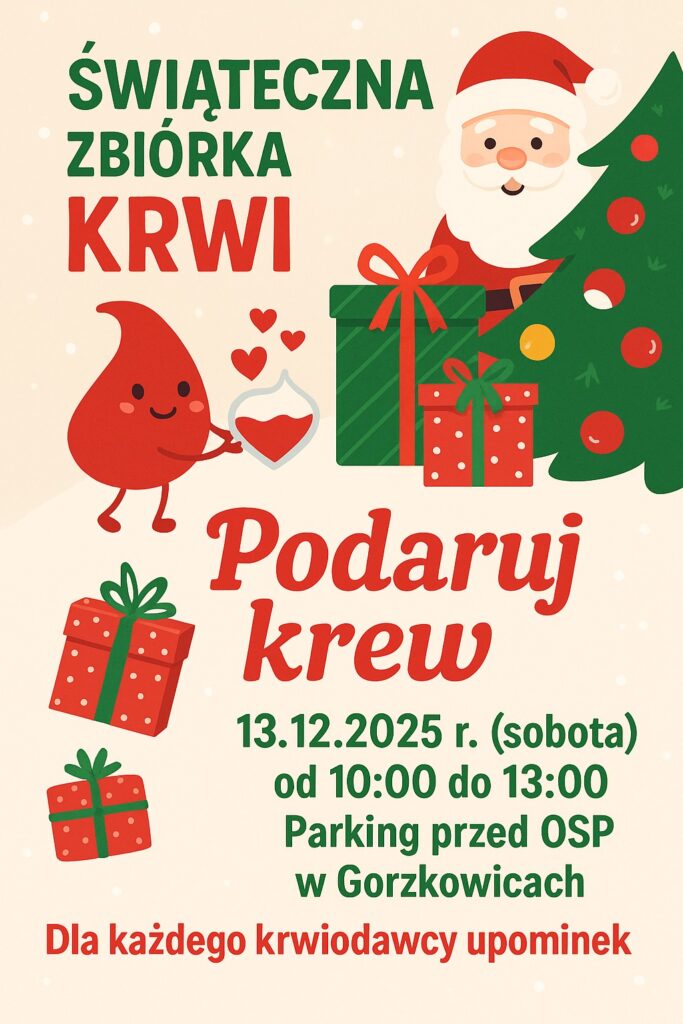 Zbiórka krwi odbędzie się w sobotę (13 grudnia) od godziny 10:00 do 13:00. Krwiobus stał będzie na parkingu przed OSP w Gorzkowicach.