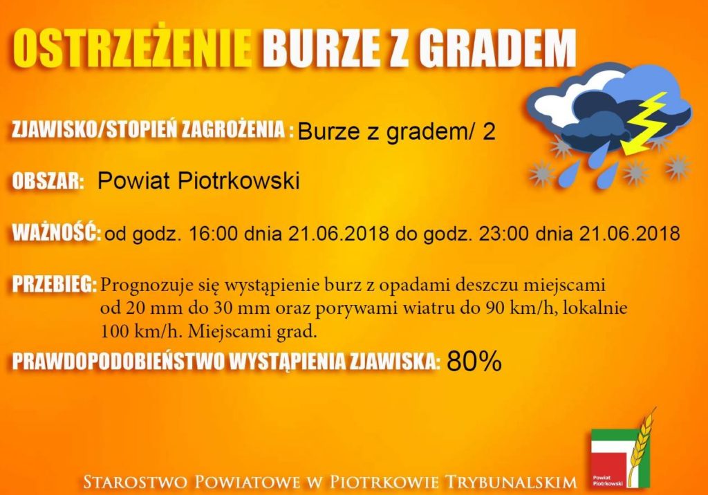 Informacje potwierdza Powiatowe Centrum Zarządzania Kryzysowego w Piotrkowie. „Prognozuje się wystąpienie burz z opadami deszczu miejscami od 20 mm do 30 mm oraz porywami wiatru do 90 km/h, lokalnie 100 km/h. Miejscami grad. Prawdopodobieństwo wystąpienia zjawisk: 80%” – czytamy w komunikacie.