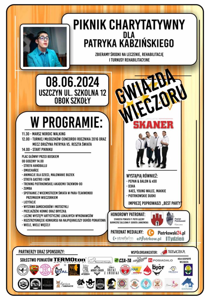 Na najbliższa sobotę (08.06) zaplanowano piknik charytatywny dla Patryka Kabzińskiego. Impreza odbędzie się boisku szkolnym w Uszczynie. – Zbieramy środki na leczenie, rehabilitacje i turnusy rehabilitacyjne Patryka – mówią organizatorzy wydarzenia. Wydarzeniem towarzyszącym będzie mecz w piłkę nożną.