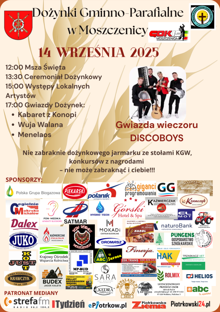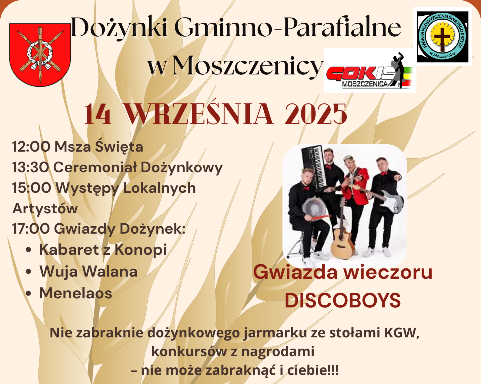 14 września zapraszamy na Dożynki Gminno-Parafialne do Moszczenicy.
