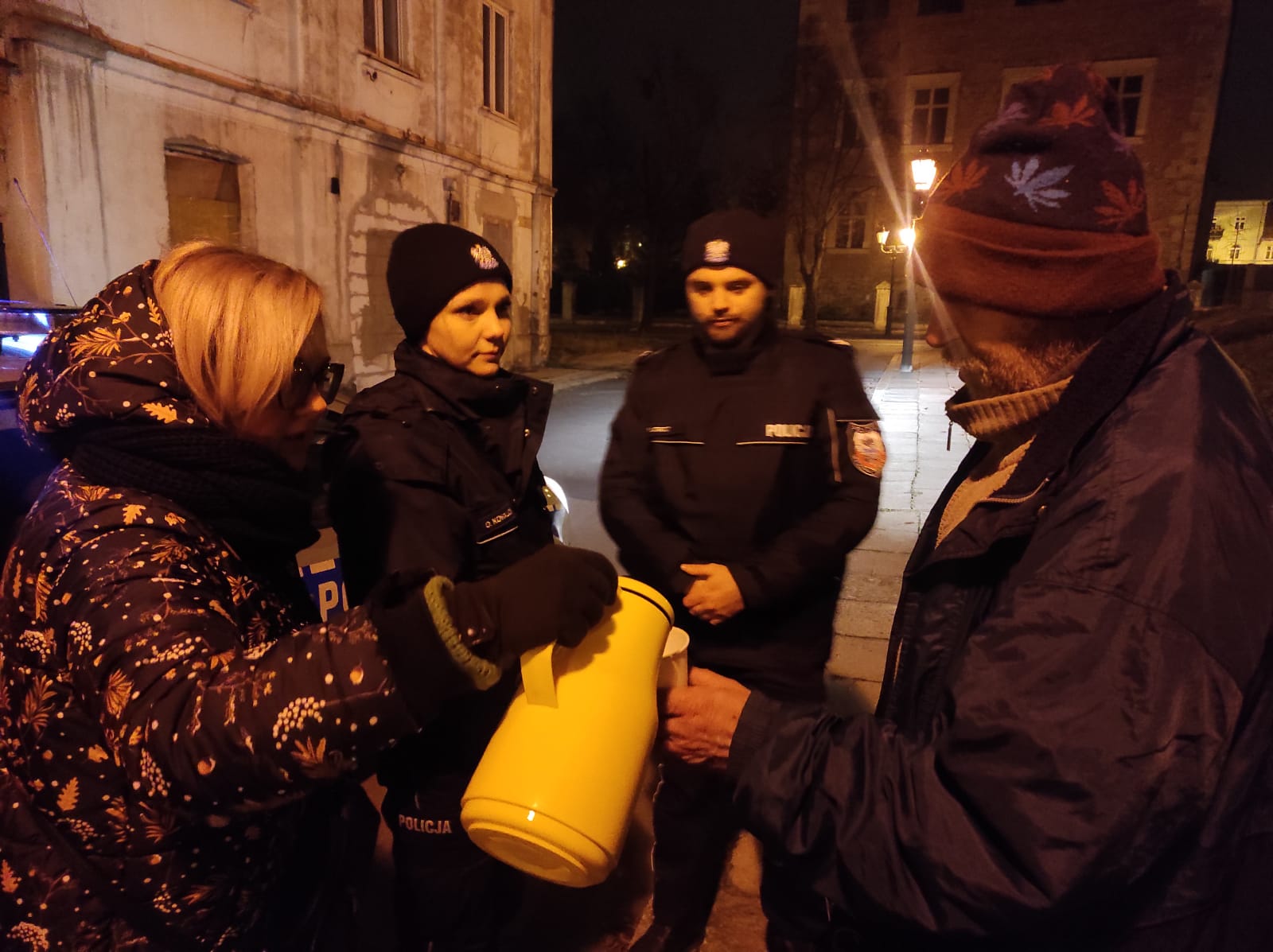 Przenosimy się na starówkę w okolice ulicy Wspólnej. Policjanci z pracownikami MOPR z łatwością wskazują kolejne lokalizacje. Napotykamy mężczyznę, który jak się okazało od 26 lat jest bezdomny. – Chcemy pana poinformować i zmotywować do tego, by zgodził się pan na przeniesienie do schroniska. Przy okazji proszę się poczęstować gorącą herbatą – mówi Joanna Suszko-Bąkiewicz wręczając mężczyźnie kubek z gorącym napojem. Ten herbatę przyjął, jednak inną pomoc odrzuca. – Mam swoje zdanie na ten temat. Od 1996 roku jestem bezdomny i jakoś żyję. Mam 58 lat, daję radę. Nie kradnę, zbieram złom, zbieram puszki. Zawsze te parę groszy mi wpadnie. Kupuję jedzenie, czasem jakieś piwo które wypiję na spokojnie. Czasem idę do znajomych posiedzieć, pooglądać telewizję czy pogadać i wracam do domu. Ja już się nauczyłem samotnego życia i tak będę żył, chociaż mam rodzinę. Ale z rodziną najlepiej to się wychodzi, na zdjęciach. Jestem niezależny i to mnie cieszy. Nie muszę się nikomu z niczego tłumaczyć – mówi mężczyzna. Pytam czy nie boi się, że zamarznie. – Czasem bywa bardzo zimno, ale nie boję się że zamarznę. Mam ciepłe ubranie i kołdry, mam się czym przykryć – mówi.
