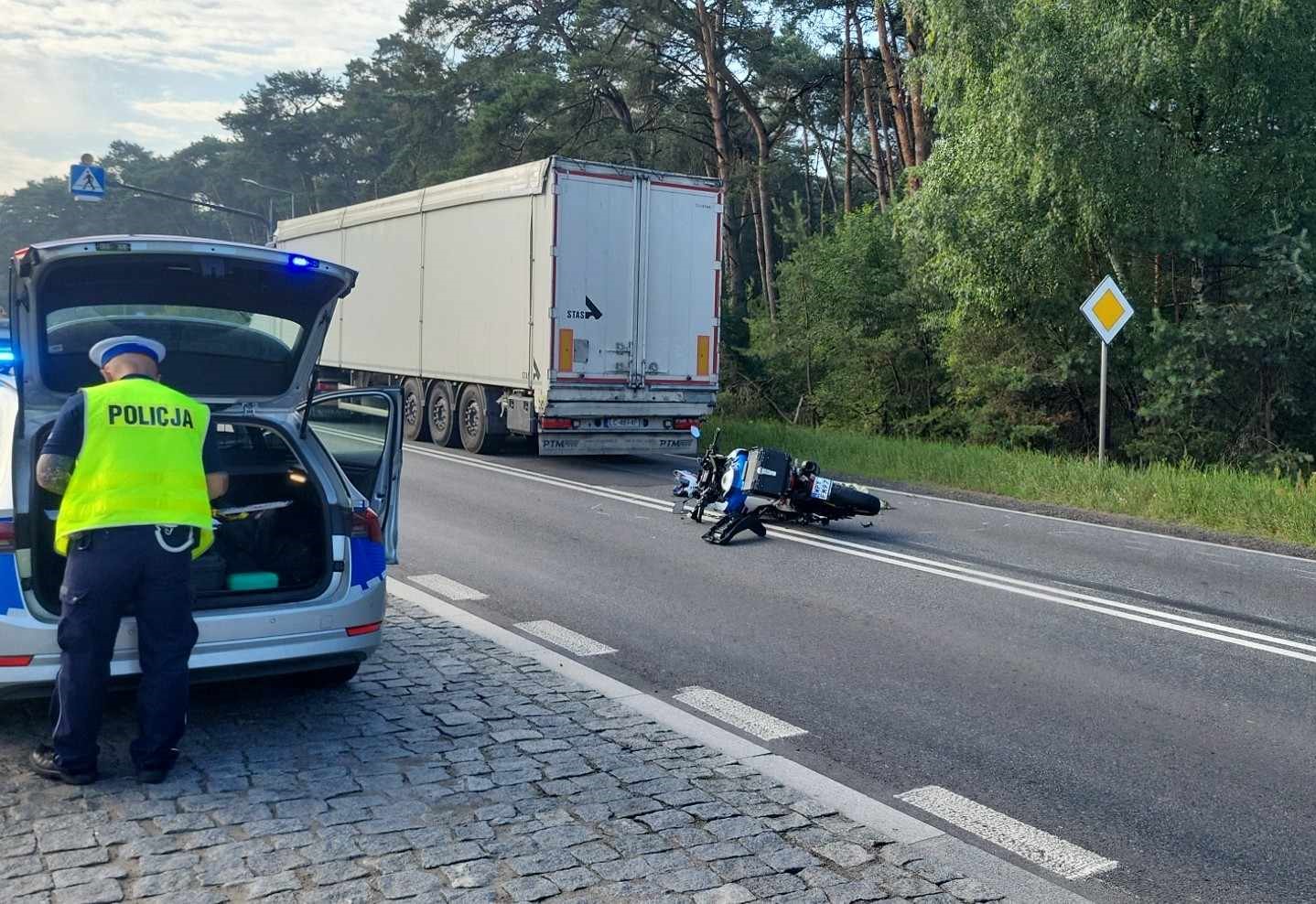 Wypadek na krajowej 12 w Przygłowie. Kierujący motocyklem najechał na tył ciężarówki. Ruch w stronę Sulejowa jest utrudniony, z kolei kierowcy jadący od strony Sulejowa w kierunku Piotrkowa, poruszają się drogą szutrową równoległa do DK12. Kierowca jednośladu przewieziony został do szpitala.