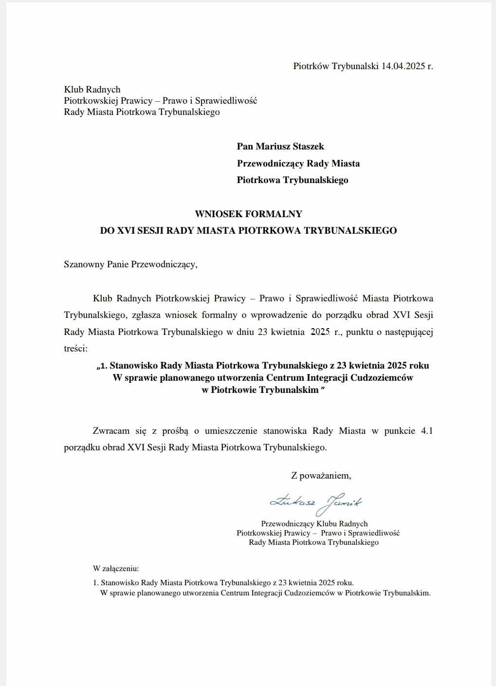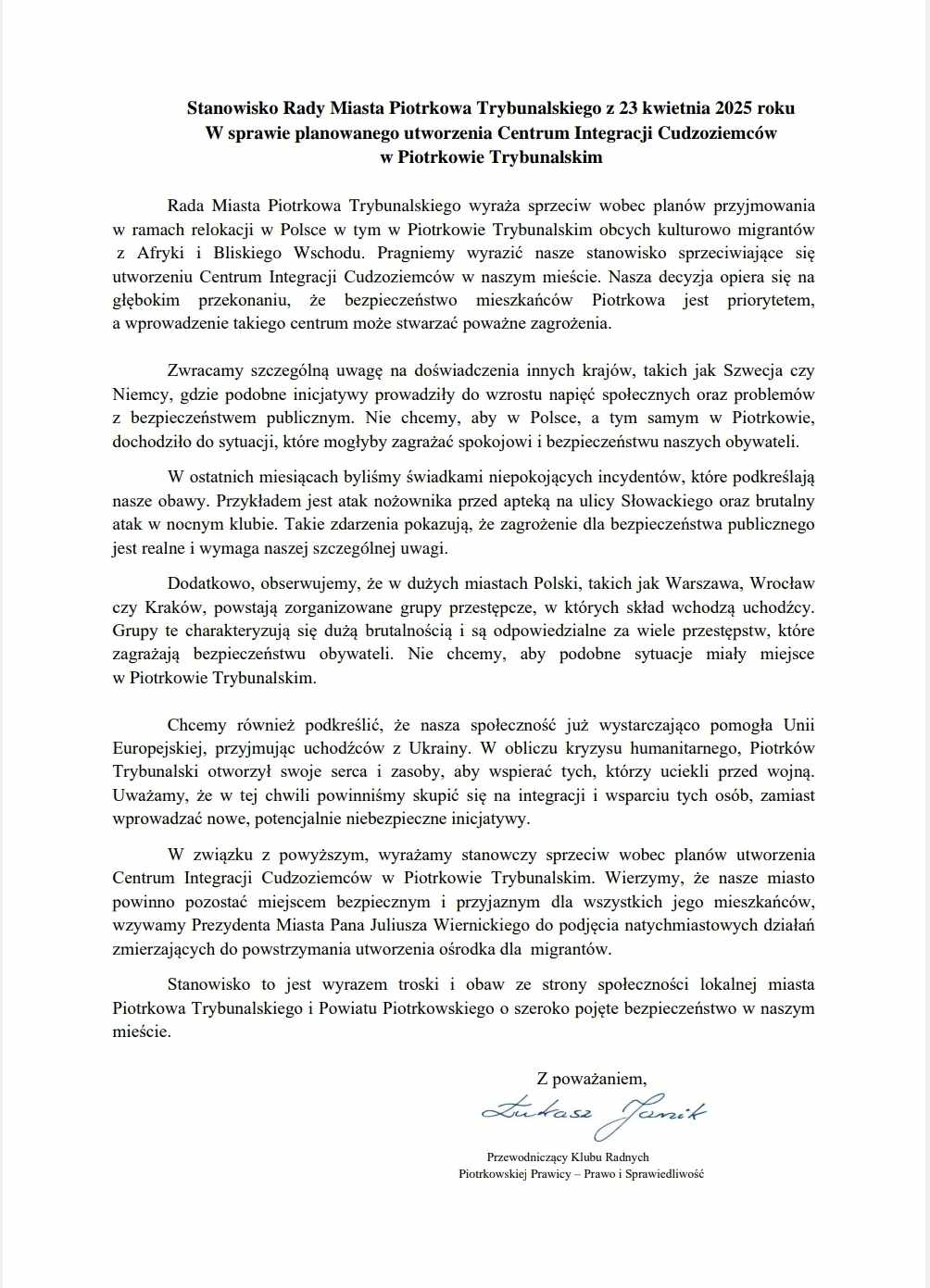 Wniosek o wprowadzenie takiego punktu złożył radny Łukasz Janik. W dokumencie, który rada miałaby przyjąć, czytamy między innymi: – Rada Miasta Piotrkowa Trybunalskiego wyraża sprzeciw wobec planów przyjmowania w ramach relokacji w Polsce, w tym w Piotrkowie Trybunalskim, obcych kulturowo migrantów z Afryki i Bliskiego Wschodu. Pragniemy wyrazić nasze stanowisko sprzeciwiające się utworzeniu Centrum Integracji Cudzoziemców w naszym mieście. Nasza decyzja opiera się na głębokim przekonaniu, że bezpieczeństwo mieszkańców Piotrkowa jest priorytetem, a wprowadzenie takiego centrum może stwarzać poważne zagrożenia. (…) Wierzymy, że nasze miasto powinno pozostać miejscem bezpiecznym i przyjaznym dla wszystkich jego mieszkańców, wzywamy prezydenta miasta Pana Juliusza Wiernickiego do podjęcia natychmiastowych działań zmierzających do powstrzymania utworzenia ośrodka dla migrantów. – pisze Janik.