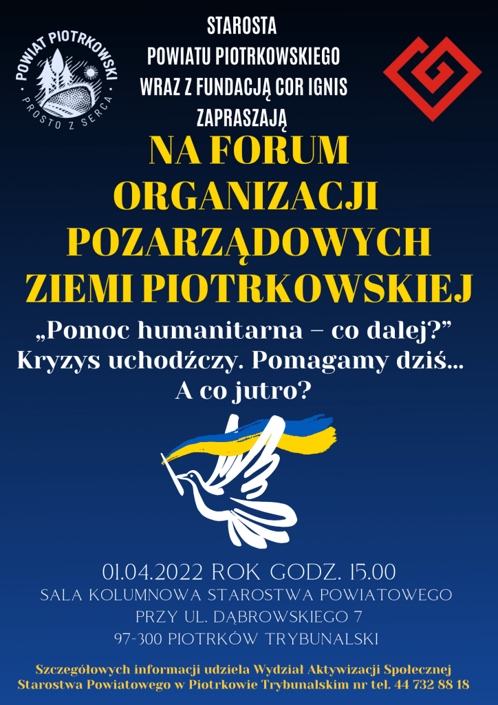 Organizacje pozarządowe, grupy nieformalne, ale także osoby, które są zainteresowane długofalową pomocą, skierowaną do uchodźców z Ukrainy, Starosta Powiatu Piotrkowskiego wraz z Fundacją Cor Ignis zaprasza na Forum Organizacji Pozarządowych Ziemi Piotrkowskiej. Spotkanie pod hasłem „Pomoc humanitarna – co dalej? Kryzys uchodźczy. Pomagamy dziś… A co jutro?” odbędzie się 1 kwietnia o godzinie 15:00 w sali kolumnowej Starostwa Powiatowego w Piotrkowie Trybunalskim, ul. Dąbrowskiego 7.