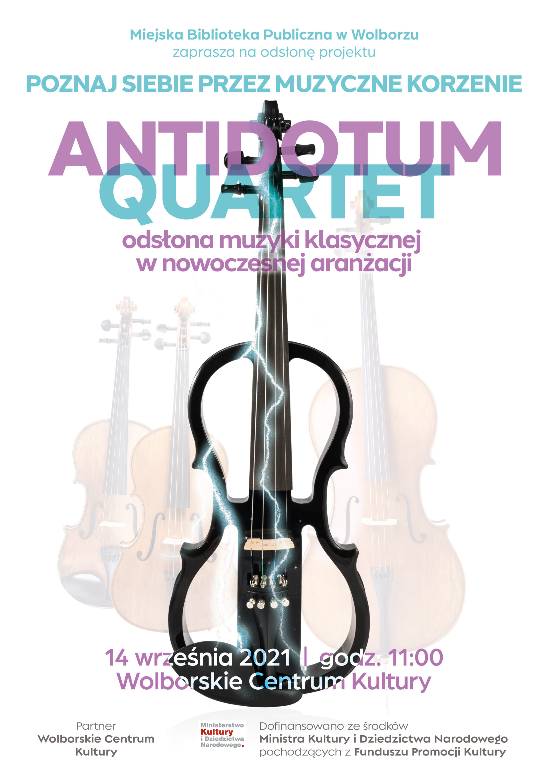 14 września 2021 godz. 11.00 – Miejska Biblioteka Publiczna w Wolborzu organizuje odsłonę projektu ,,Poznaj siebie przez muzyczne korzenie” dofinansowanego ze środków Ministra Kultury i Dziedzictwa Narodowego pochodzących z Funduszu Promocji Kultury. Czytelnicy biblioteki wysłuchają koncertu muzyków z Antidotum Quartet, którego celem będzie przekonanie odbiorców, że muzyka klasyczna może mieć nowoczesny wydźwięk, wykonanie, bez zatracenia na swojej wartości, a na zaciekawieniu beneficjentów zupełnie inną odsłoną klasyki.
