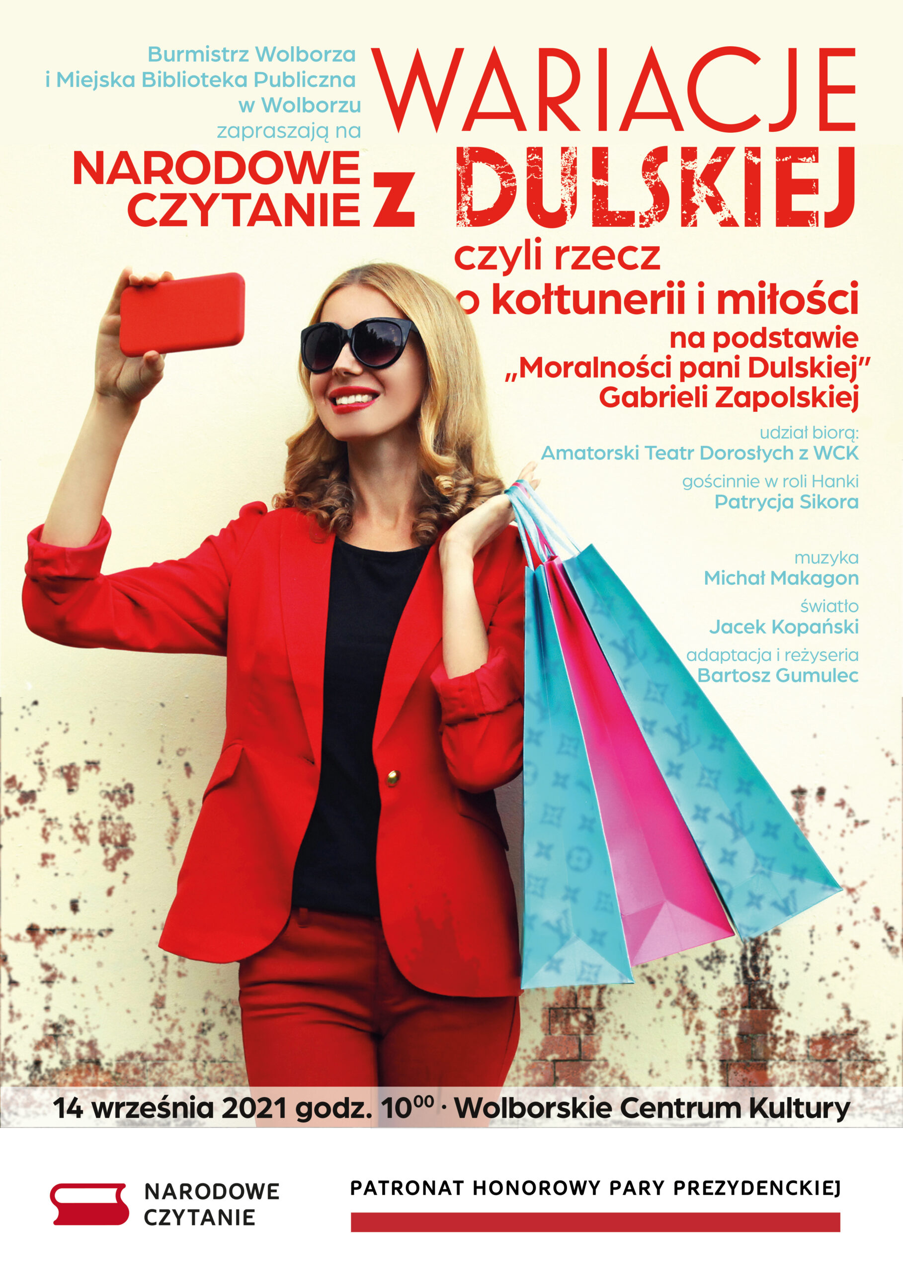 14 września 2021 godz. 10.00 – Miejska Biblioteka Publiczna w Wolborzu zaprasza na Narodowe Czytanie, podczas którego zobaczymy spektakl Wariacje z Dulskiej, czyli rzecz o kołtunerii i miłości na podstawie „Moralności pani Dulskiej” Gabrieli Zapolskiej, w którym zaprezentuje się Amatorski Teatr Dorosłych z WCK, gościnnie w roli Hanki Patrycja Sikora.