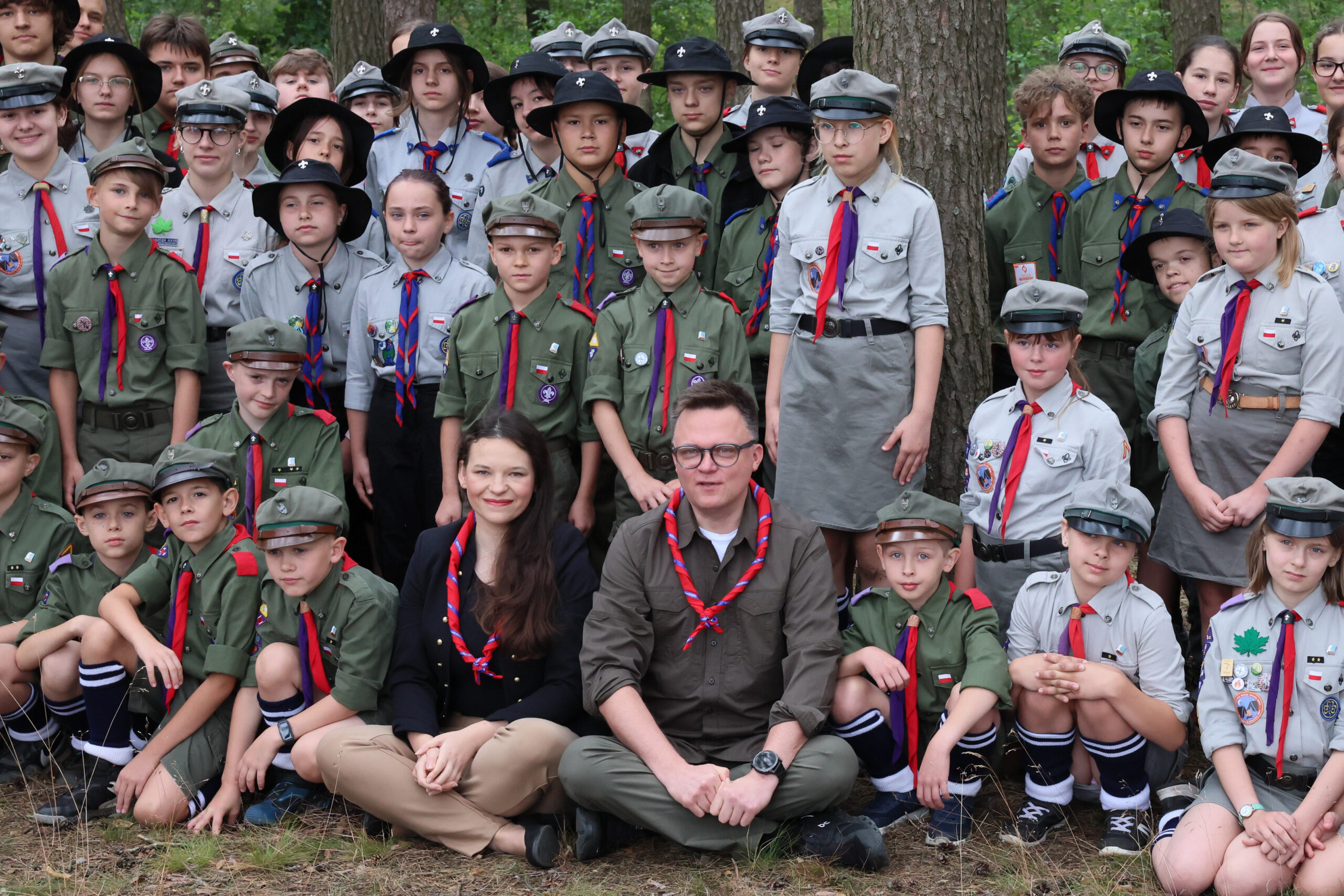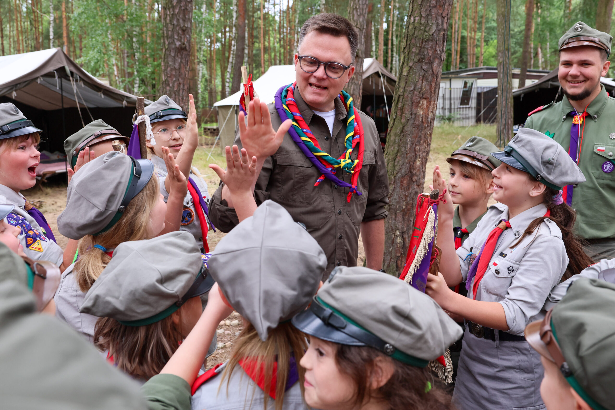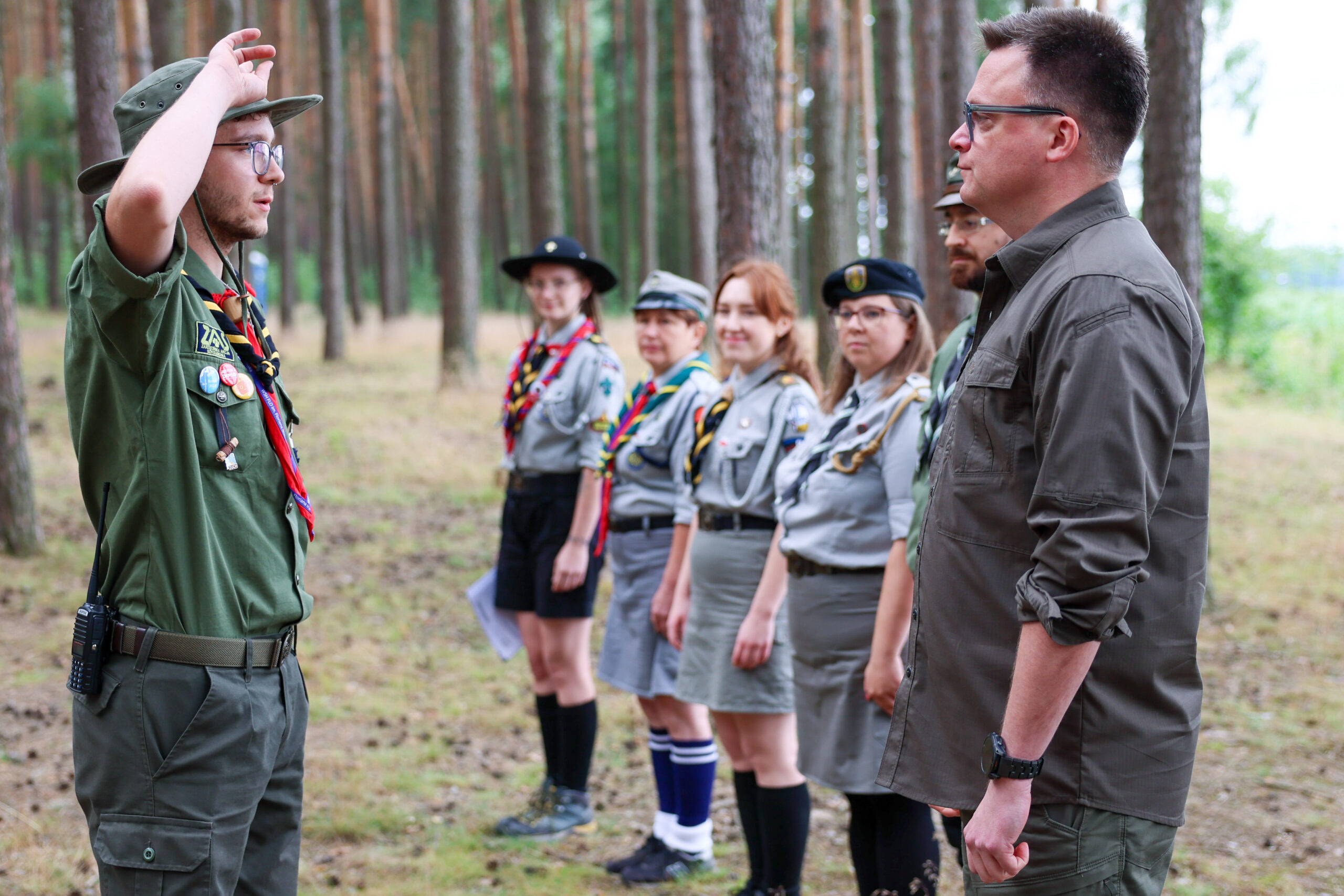 – Dzisiaj każdemu z waszych obozów chciałbym podarować flagę RP. Taką flagę, którą rozdaję w całej Polsce jako marszałek Sejmu harcerzom, harcerkom, ale też ratownikom, żołnierzom, strażakom – wszystkim tym, którzy służą nam wszystkim. Ponieważ wy też służycie nam wszystkim, naszej wspólnocie, jesteście częścią tej wielkiej rodziny ludzi służby, więc i wam chciałbym tę flagę przekazać – powiedział Szymon Hołownia.