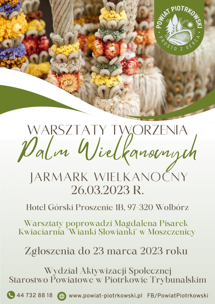 Jarmark Wielkanocny w Hotelu Górski w Proszeniu, którego współorganizatorem jest powiat piotrkowski zbliża się wielkimi krokami. Jednym z jego punktów będą warsztaty tworzenia palm wielkanocnych, na które zaprasza starostwo powiatowe w Piotrkowie Trybunalskim wraz z kwiaciarnią „Wianki Słowianki” w Moszczenicy.