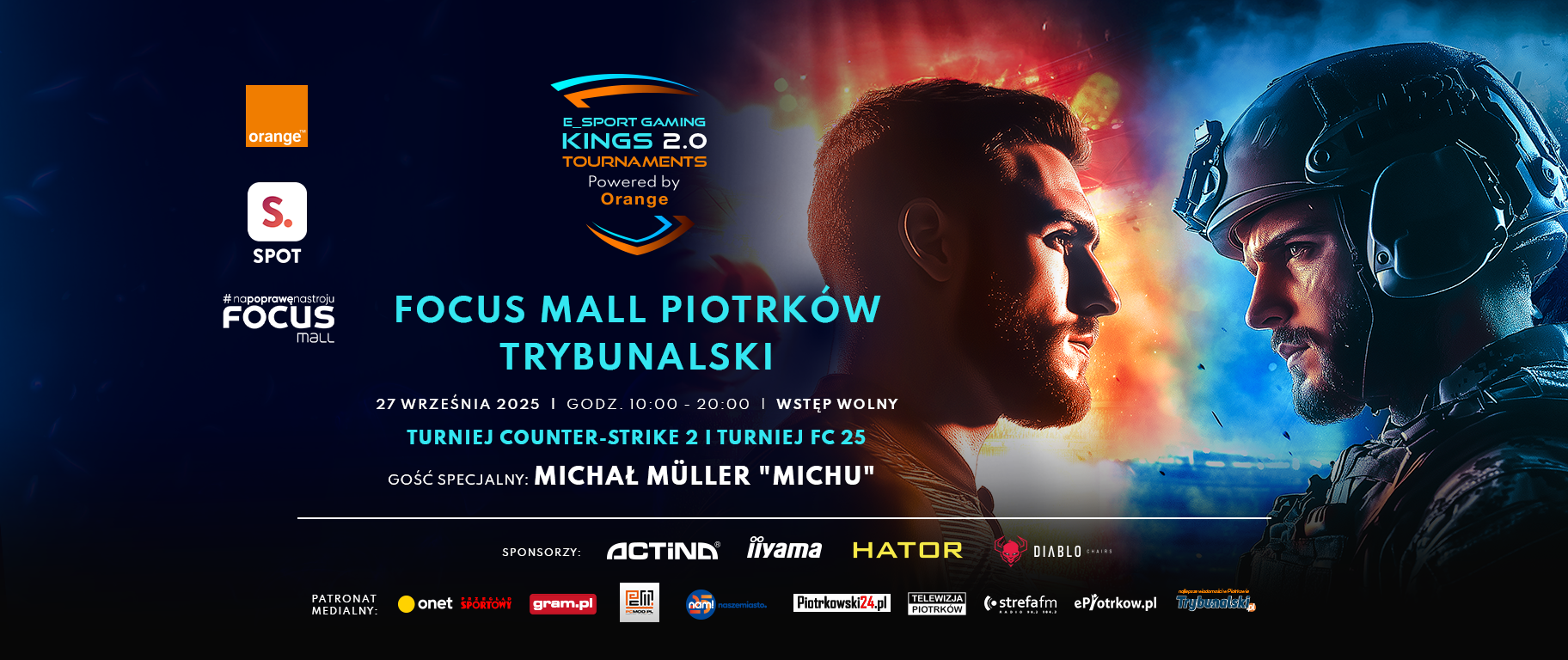 Druga edycja E-Sport Gaming Kings Tournaments 2.0 Powered by Orange to jedno z największych wydarzeń e-sportowych w Polsce. W sobotę 27 września w Focus Mall w Piotrkowie Trybunalskim gracze Counter-Strike 2 i EA Sports FC 25 zmierzą się w bezpośrednich starciach o nagrody, uznanie i bilety do ogólnopolskiego finału. Nie zabraknie ciekawych gości, m.in. zawodowych graczy e-sportu, takich jak Michał Müller (Michu). Wydarzeniu towarzyszą panele eksperckie dotyczące e-sportu.