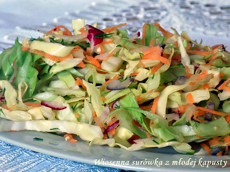 Wiosna rozgościła się u nas, mam nadzieję, już na dobre. Na straganach pojawiają się młode, apetyczne warzywa, czyli nowalijki. Niestety swoimi walorami, zarówno smakowymi, jak i odżywczymi, odbiegają od tych zbieranych w sezonie. Dietetycy zalecają umiar w spożywaniu nowalijek ze względu na to, iż zawierają zdecydowanie więcej azotanów niż warzywa uprawiane na działce czy na polu, na które oddziałują naturalne promienie słoneczne. Jednak, jak tu się oprzeć czerwieni rzodkiewki czy aromatowi młodego koperku? Sami przyznacie, że ciężko. Dlatego, jako dodatek do obiadu, polecam wiosenną surówkę z młodej kapusty oraz pyszną przystawkę z rzodkiewek.