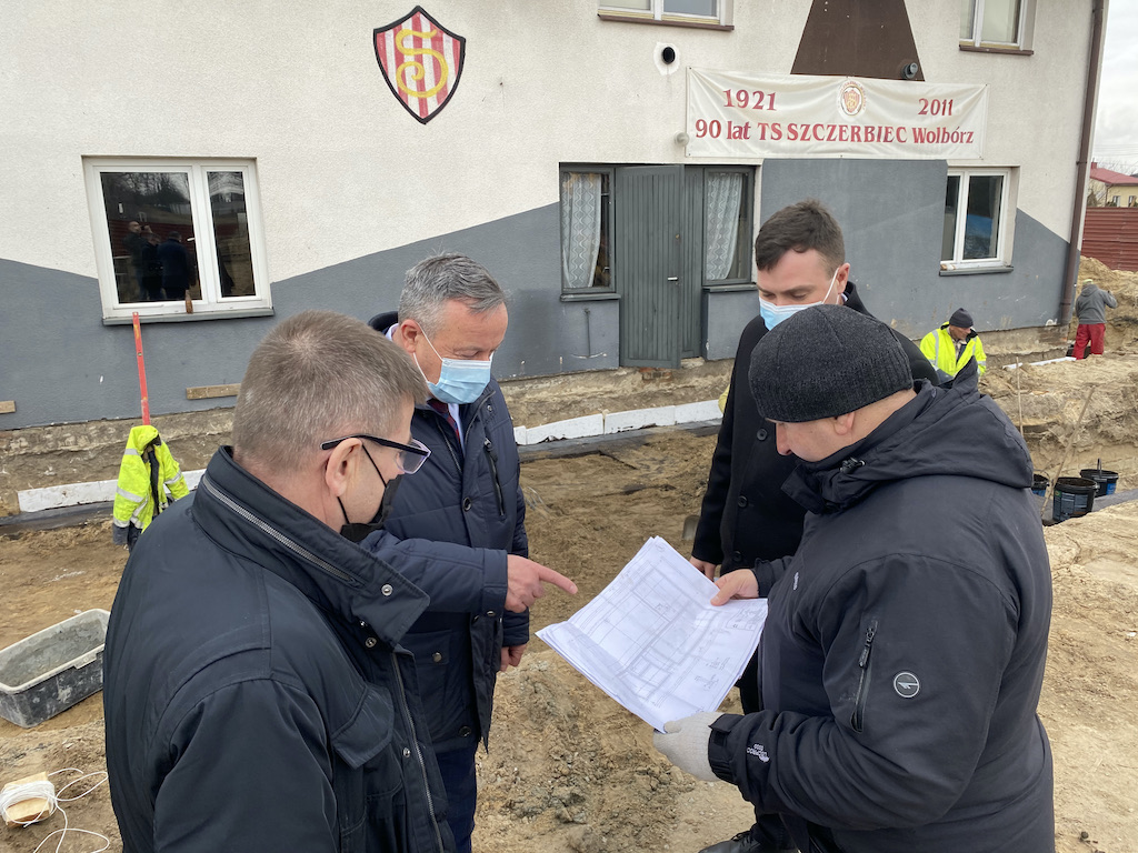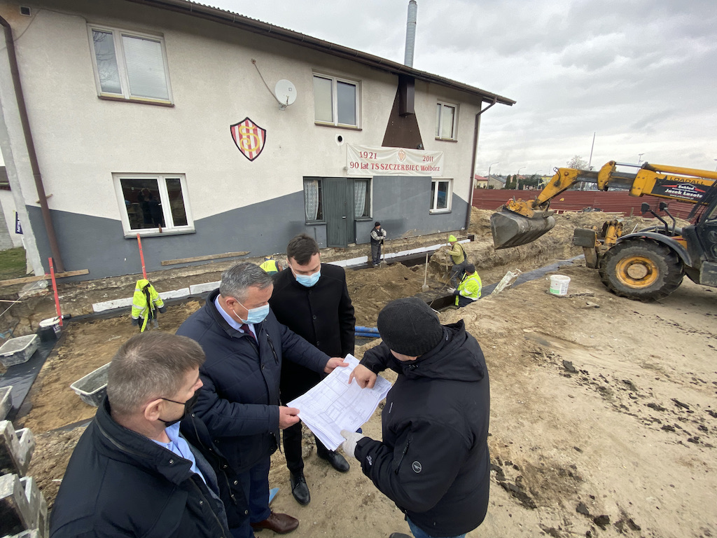 Rozbudowa budynku TS Szczerbiec Wolbórz, które w tym roku obchodzi jubileusz 100 lecia istnienia, wkroczyła w fazę realizacji. Planowana od wielu miesięcy inwestycja była szeroko konsultowana z Zarządem TS Szczerbiec oraz z radnymi Rady Miejskiej. Dziś z wykonawcą na placu budowy spotkali się Andrzej Jaros Burmistrz Wolborza, z-ca Burmistrza Dymitr Jędryka i przewodniczący Rady Miejskiej Zbigniew Klewin.