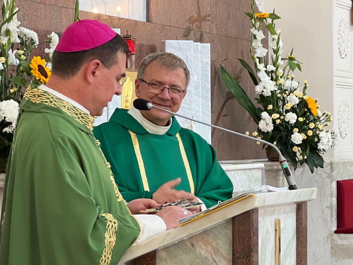 Przed rozpoczęciem mszy św. odbyło się odczytanie odpowiednich dekretów nominacyjnych przez ks. bpa Marka Marczaka i przełożonego Prowincji Warszawskiej Redemptorystów, o. Dariusza Paszyńskiego CSsR i powitanie wspólnoty redemptorystów w piotrkowskiej parafii, również chlebem i solą przez przedstawicieli wspólnoty parafialnej. Przywołane przez nich słowa św. Jana Pawła II o wspólnej drodze, potężnej miłości, pokornej modlitwie i wytrwałej nadziei, przewijały się potem przez całą uroczystość.