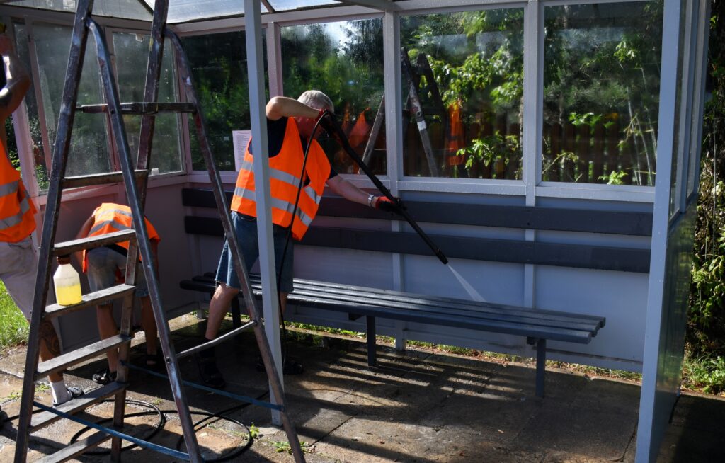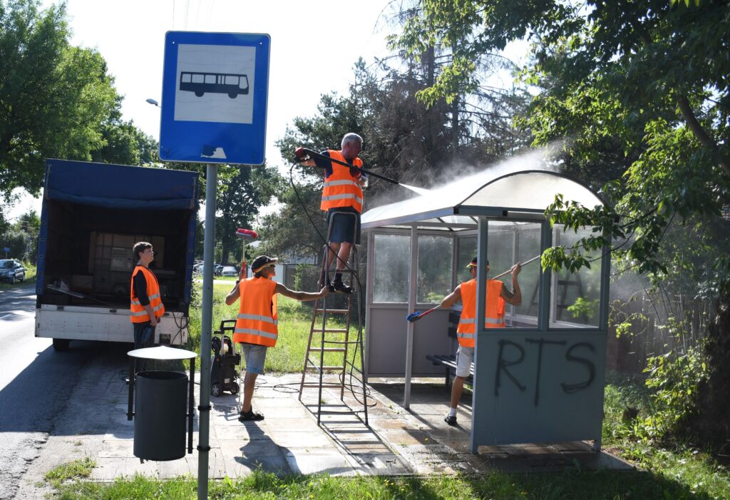 Zadanie obejmuje umycie całej konstrukcji wiaty łącznie z dachem. Do czyszczenia wykorzystywane jest urządzenie wysokociśnieniowe i woda z dodatkiem detergentów. Dodatkowo ławki, gabloty, tabliczki na rozkłady jazdy oraz kosze na śmieci są przemywane odpowiednim środkiem dezynfekującym.