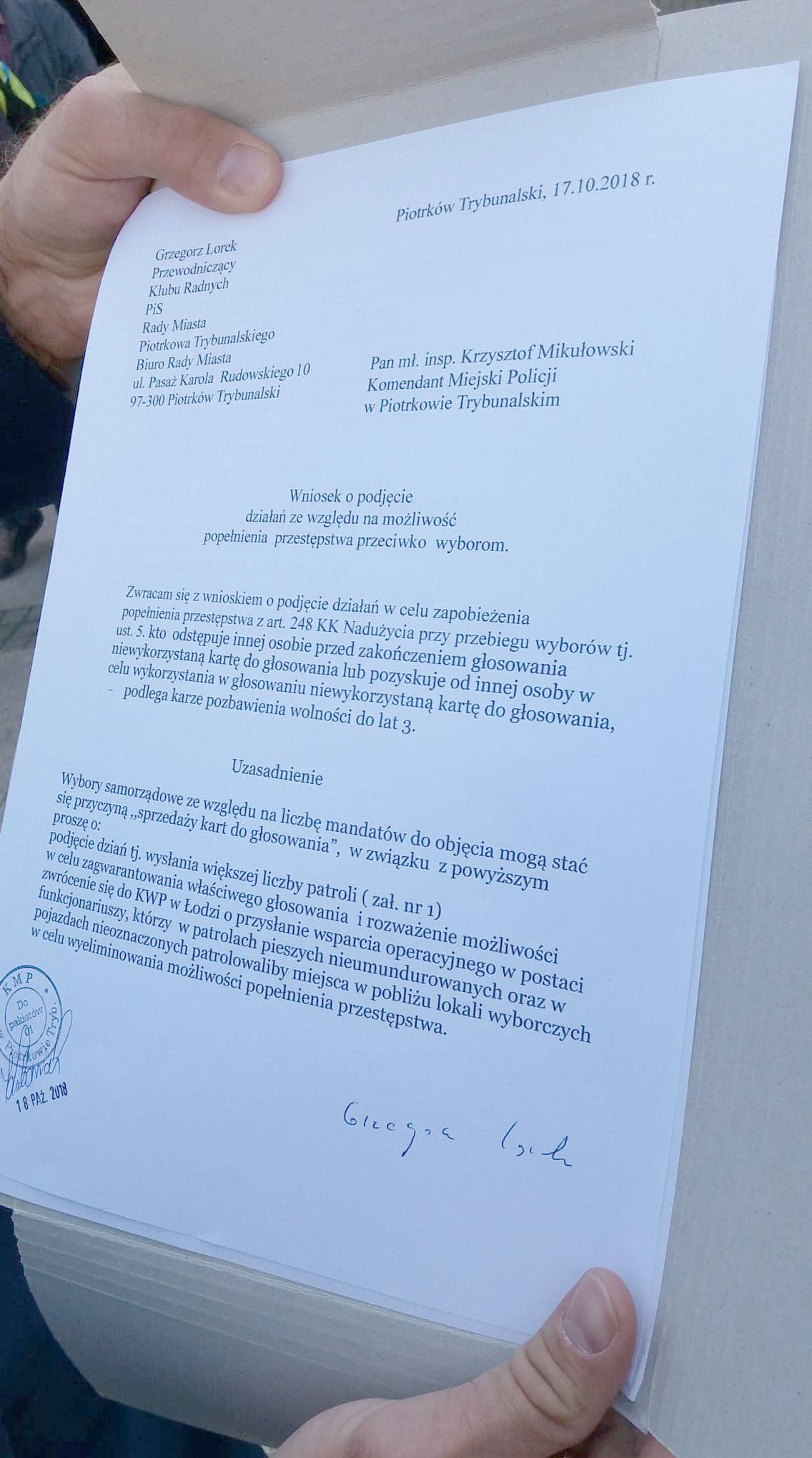 – Niepokoi nas to, co może dziać się w dniu wyborów. Mam nadzieję, że tradycje piotrkowskiego parlamentaryzmu, czyli kupowanie szabel, nie przełoży się na nadchodzące wybory. Złożyłem pismo do Komendanta Miejskiego Policji w Piotrkowie, z prośbą o podjęcie wszelkich działań, by wybory w Piotrkowie przebiegły spokojnie. W tym celu uruchomiony będzie specjalny numer telefonu, na który mieszkańcy będą mogli dzwonić i informować o procederze kupowania głosów – powiedział Grzegorz Lorek z PiS, dodając: – Apeluję do wszystkich komitetów o akcje obywatelską. Mamy 100-lecie odzyskania niepodległości. Jestem Polakiem, idę na wybory i nie sprzedaję swojego głosu! To jest bardzo ważne. Mamy swój głos, możemy go oddać na wybranego kandydata, dlatego idźmy na wybory jak największą rzeszą ludzi i nie sprzedawajmy głosów. Patrzmy czy ktoś to robi, a jeśli tak, to informujmy o tym policję – powiedział polityk.