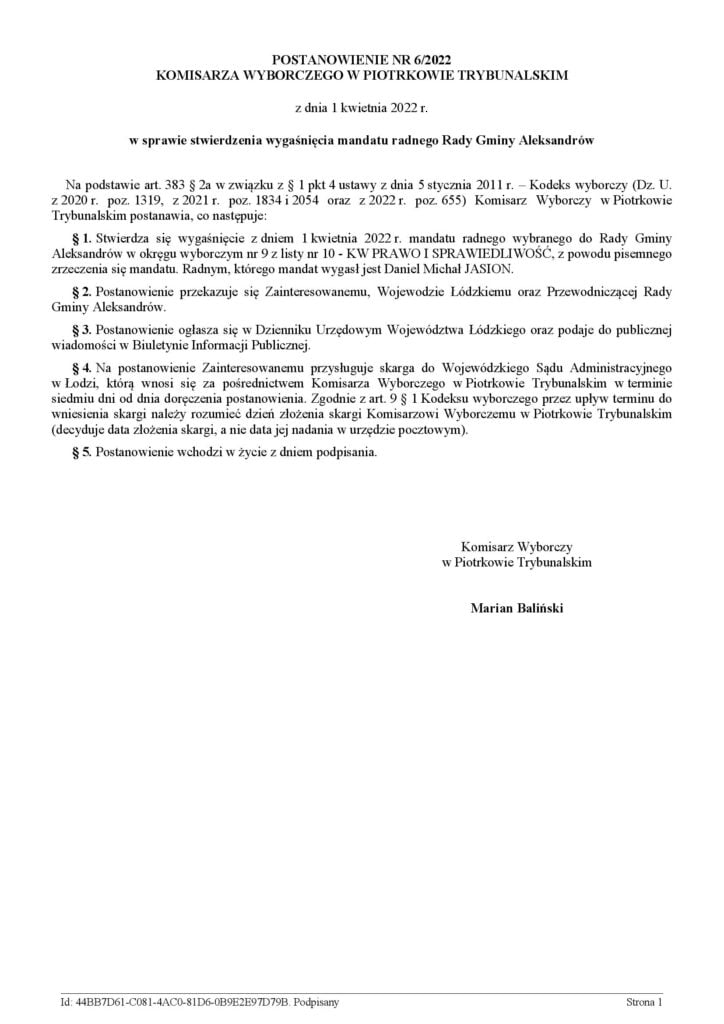Komisarz Wyborczy w Piotrkowie Trybunalskim wygasił mandat radnego Rady Gminy Aleksandrów Daniela Jasiona. Decyzję podjęto w związku pisemnym zrzeczeniem się mandatu przez radnego.