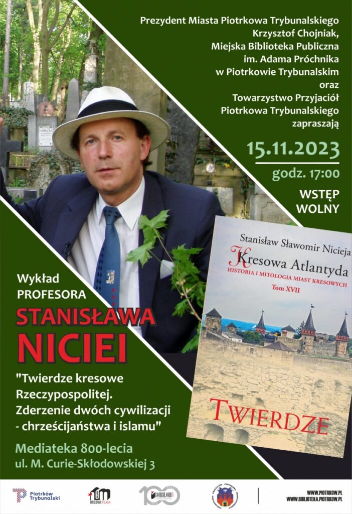Miejska Biblioteka Publiczna zaprasza w środę (15.11) na wykład prof. Stanisława Niciei pt. „Twierdze kresowe Rzeczypospolitej. Zderzenie dwóch cywilizacji – chrześcijaństwa i islamu”. Będzie to trzecie spotkanie z cyklu pn. „Kresy” organizowanego przez Towarzystwo Przyjaciół Piotrkowa Trybunalskiego. Początek spotkania o godz. 17.00 w Mediatece 800-lecia.