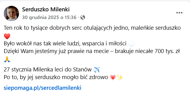 Dzięki ogromnej mobilizacji darczyńców udało się zebrać już większość kwoty, jednak licznik na portalu Siepomaga wciąż pokazuje brakujące 700 tysięcy złotych, a termin operacji zaplanowany jest na 27 stycznia. – Dostałam wiadomość z kliniki, która znów wywołała ogromny strach! Ale musimy powiedzieć to wprost – bez brakujących 20% operacja Milenki NIE MOŻE się odbyć! Tak strasznie byłoby teraz przegrać! Dzięki Wam 80% kwoty trafiło już do kliniki.