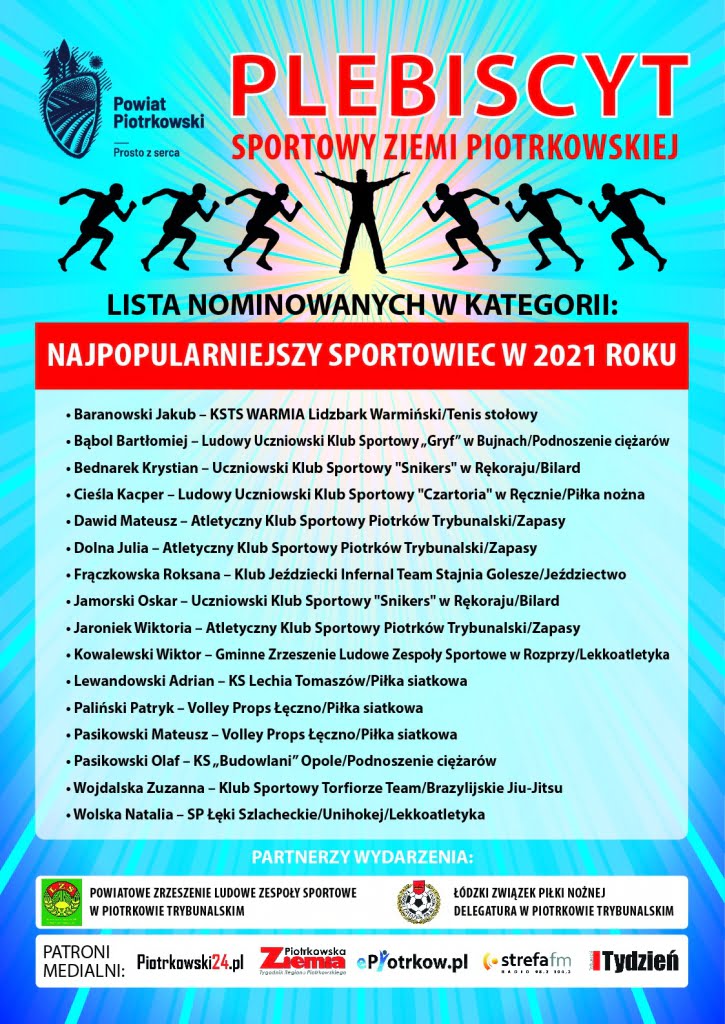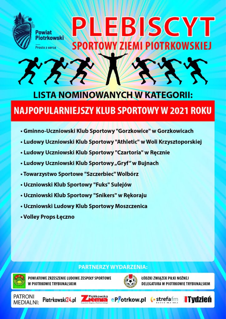 Na funpage Powiatu Piotrkowskiego rozpoczęło się głosowanie w Plebiscycie na Najpopularniejszy Klub Sportowy i Najpopularniejszego Sportowca w 2021 roku. Wyboru można dokonywać spośród zgłoszonych kandydatów do 21 lutego do g. 12.00 poprzez „reakcję” pod zdjęciem/herbem/logo nominowanego klubu sportowego – zamieszczonym na FB/PowiatPiotrkowski. Nagrodzimy tych, którzy w poszczególnych kategoriach uzyskają największą liczbę głosów.
