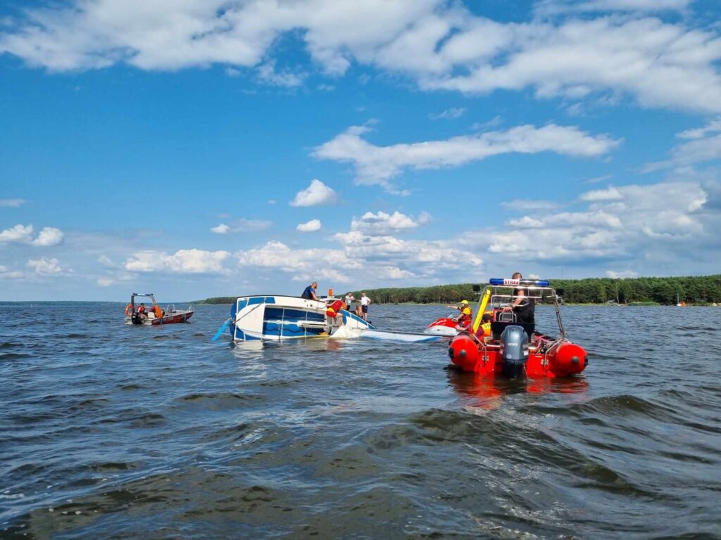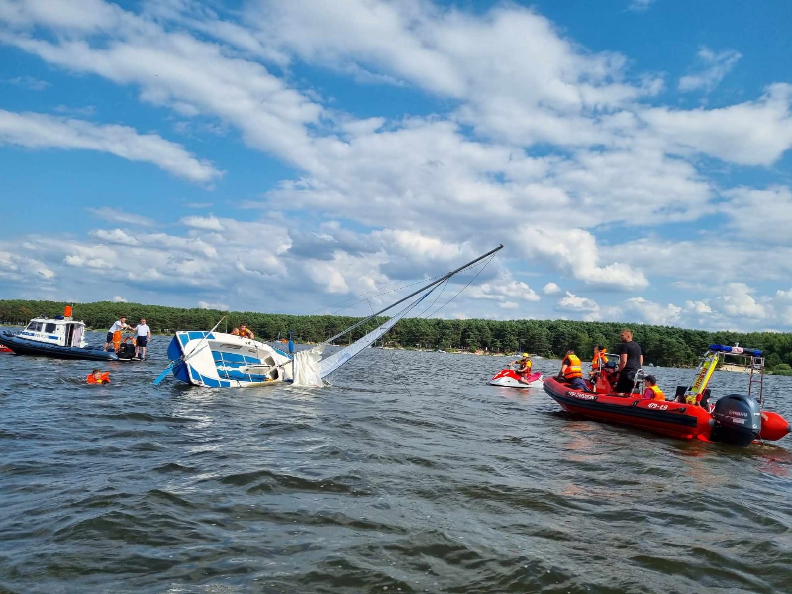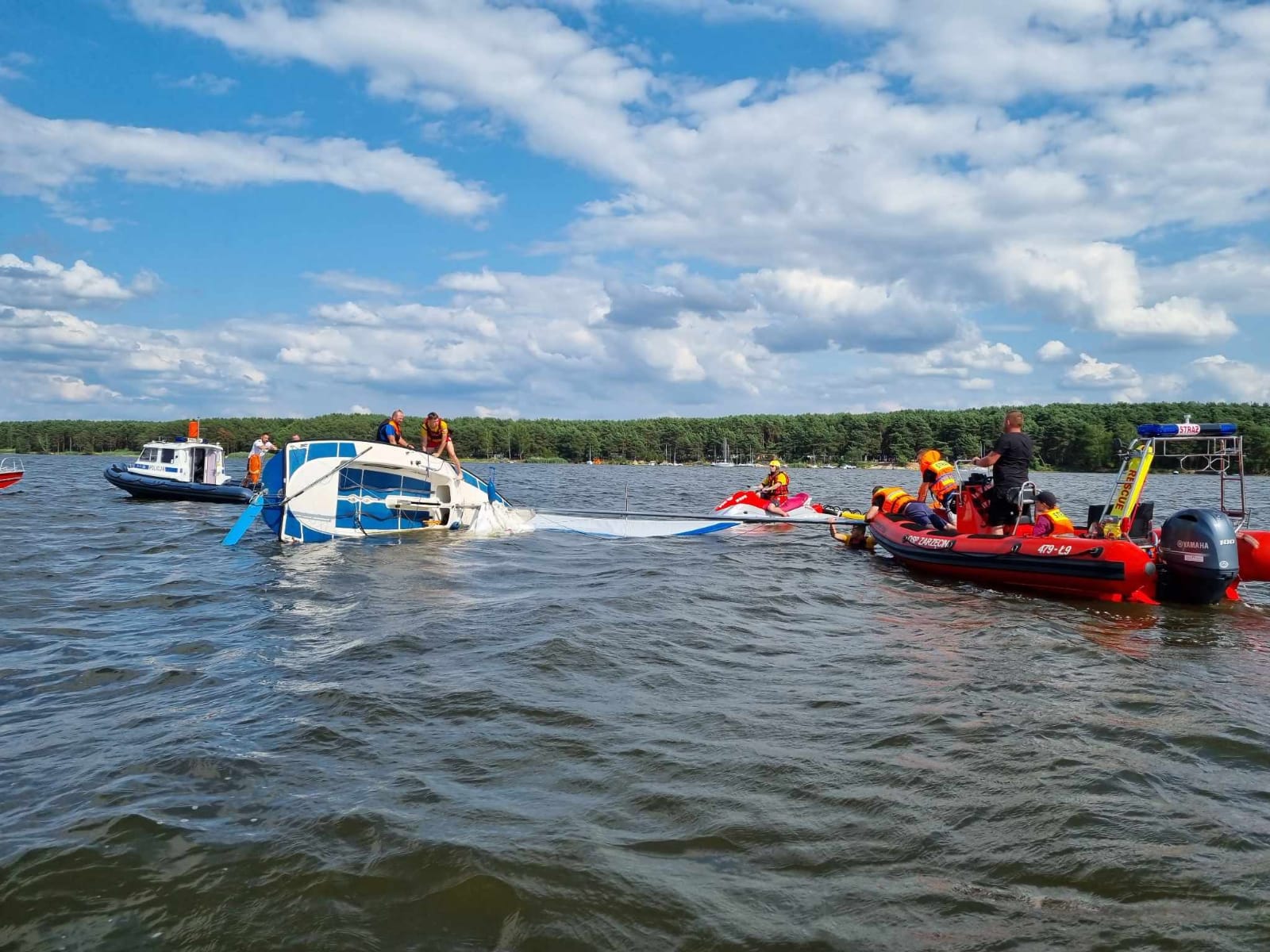 22 lipca 2023 roku po godzinie 15:00 piotrkowscy wodniacy, na co dzień pełniący służbę w Posterunku Policji w Barkowicach Mokrych otrzymali zgłoszenie, że na Zalewie Sulejowskim, na wysokości miejscowości Zarzęcin doszło do przewrócenia jachtu żaglowego. – Mundurowi od razu ruszyli na ratunek. Dopływając na miejsce zauważyli przewrócony jacht, obok którego w wodzie dryfowały dwie osoby. Wspólnie ze strażakami ochotnikami z Zarzęcina od razu podjęli akcję ratunkową, aby jak najszybciej wydobyć je z wody. Po zapewnieniu bezpieczeństwa podróżującym oraz zapewnieniu im komfortu termicznego mundurowi rozpoczęli podnoszenie przewróconej łodzi. Po chwili na miejsce dopłynęły również dwa patrole wodniaków z Tomaszowa Mazowieckiego, którzy włączyli się do akcji. Dzięki wspólnym działaniom, już chwilę po zdarzeniu jacht wraz z załogą bezpiecznie przemieszczono do portu. W rozmowie ze sternikiem policjanci ustalili, że przyczyną wywrócenia się łódki były silne podmuchy wiatru. Mężczyzna był trzeźwy, a dzięki szybkiej reakcji służb oraz posiadanym przez załogę środków bezpieczeństwa nikt nie odniósł obrażeń – relacjonuje asp. sztab. Izabela Gajewska z KMP w Piotrkowie,