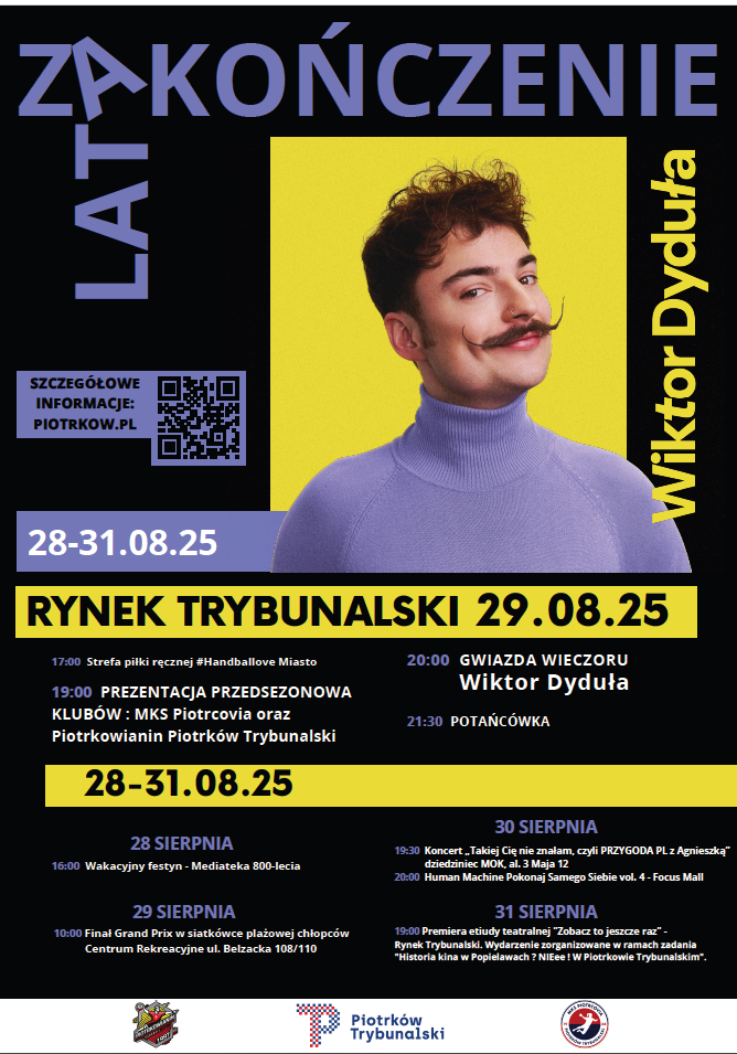 Przed nami wspólne pożegnanie lata – będzie bardzo sportowo, muzycznie i tanecznie – a wielki finał odbędzie się w Rynku Trybunalskim. W programie m.in. przedsezonowa prezentacja klubów MKS Piotrcovia i Piotrkowianin Piotrków Trybunalski, potańcówka i koncert Wiktora Dyduły!