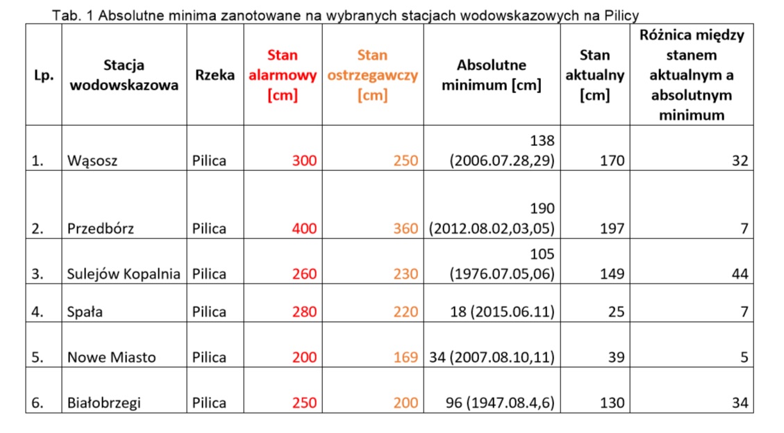 Aktualne stany wody na wszystkich stacjach wodowskazowych są wyższe niż notowane na nich absolutne minima (tabela poniżej), które były obserwowane w 1947, 1976, 2006, 2007, 2012 i 2015 roku. Najmniejszą różnicę pomiędzy stanem aktualnym a absolutnym minimum zanotowano na stacji w Nowym Mieście i obecnie wynosi ona 5 cm. Stany wody na wybranych wodowskazach układają się głównie w strefie wody niskiej jedynie na stacji Wąsosz i Sulejów Kopalnia w średniej.