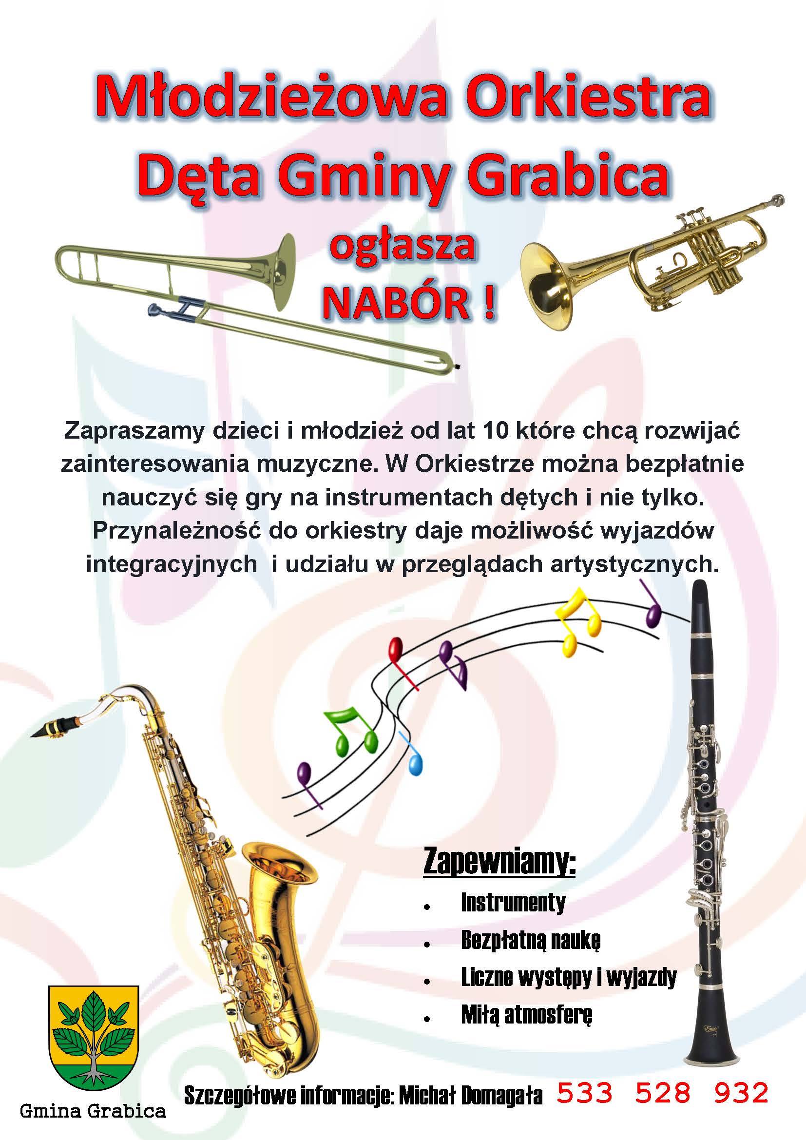 Orkiestra Dęta w Grabicy poszukuje osób, które chcą się rozwijać muzycznie. Orkiestra zaprasza dzieci i młodzież powyżej 10 roku życia, które chcą uczyć się grać na instrumentach dętych, ale nie tylko. Szczegóły na plakacie.