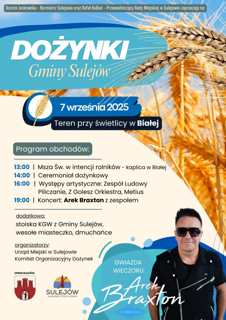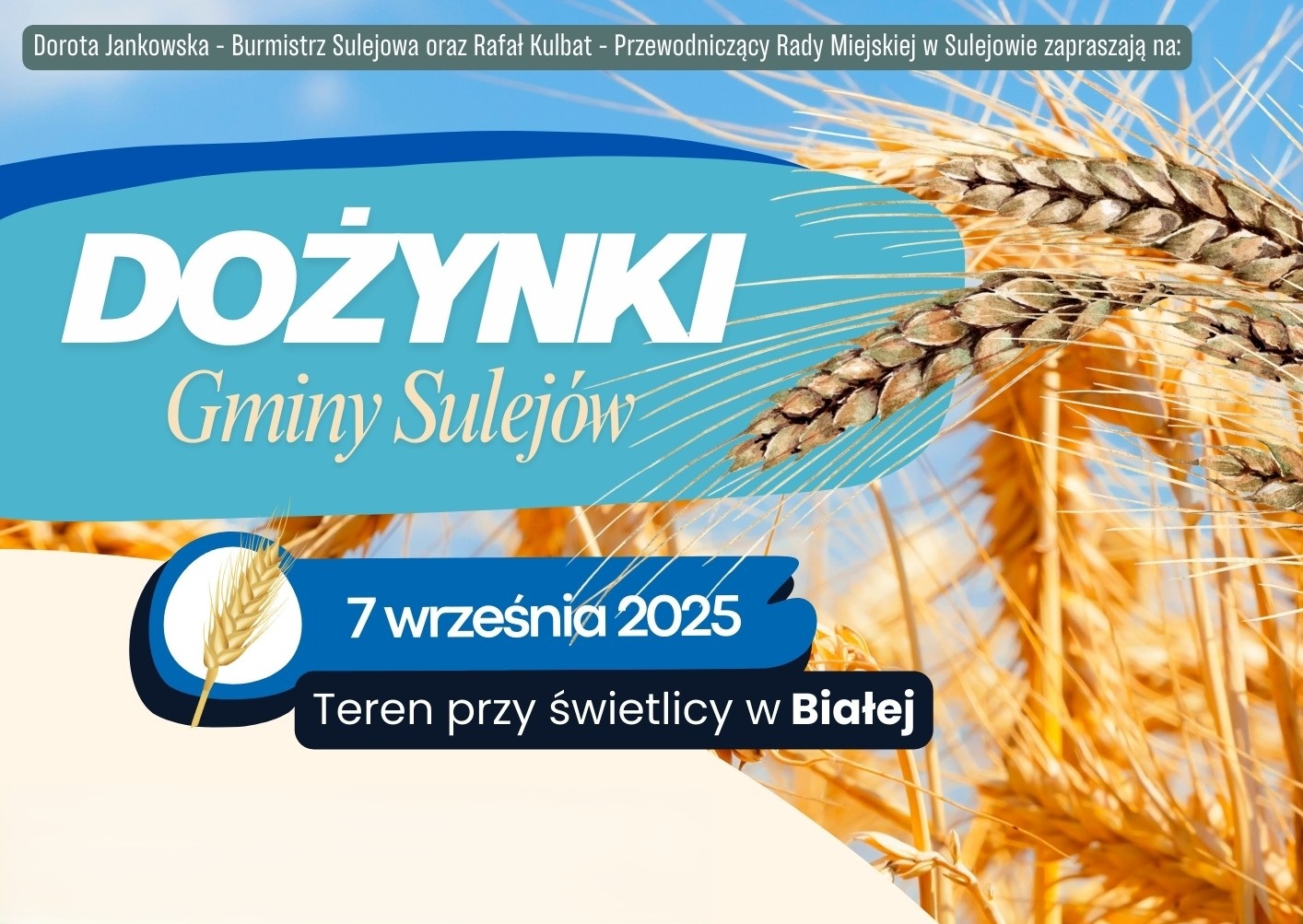 Dorota Jankowska – Burmistrz Sulejowa oraz Rafał Kulbat – Przewodniczący Rady Miejskiej w Sulejowie serdecznie zapraszają na tegoroczne święto plonów! Już w niedzielę, 7 września 2025 r. na terenie przy świetlicy w Białej.