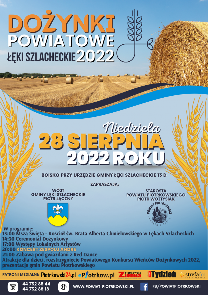 Starosta Powiatu Piotrkowskiego Piotr Wojtysiak wraz z Piotrem Łącznym Wójtem Gminy Łęki Szlacheckie, zaprasza wszystkich rolników na Powiatowe Święto Plonów do Łęk Szlacheckich. Uroczystości zaplanowano 28 sierpnia 2022 roku o 1300, które rozpocznie Msza Święta w Kościele św. Brata Alberta Chmielowskiego w Łękach Szlacheckich. Po nabożeństwie w barwnym korowodzie, uczestnicy wydarzenia przejdą na boisko przy Urzędzie Gminy, gdzie odbędzie się ceremoniał dożynkowy, podczas którego pokrojony zostanie chleb i wręczone wieńce. Poznamy także laureata honorowego tytułu „Za zasługi dla Powiatu Piotrkowskiego”. Plac dożynkowy wypełnią stoiska Kół Gospodyń Wiejskich z regionalnymi przysmakami, powiatowe jednostki organizacyjne oraz instytucje działające na rzecz rolników. Dla dzieci organizatorzy przygotowali dmuchańce. Gości dożynkowych bawić będą lokalni artyści: Choberki, Piotrkowianie, Ludowa Biesiada z Czarnocina, Zespół Pieśni i Tańca Gorzkowice, Kapela spod Dębu, Kapela spod Diablej Góry, Zespół Sami Swoi, Zespół Rajcza, Red Dance. Na finał o 2000 zagra ANDRE.