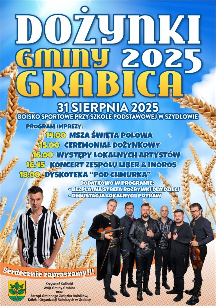 Na dożynki zapraszają: Wójt Gminy Grabica Krzysztof Kuliński oraz Zarząd Gminnego Związku Rolników, Kółek i Organizacji Rolniczych w Grabicy.