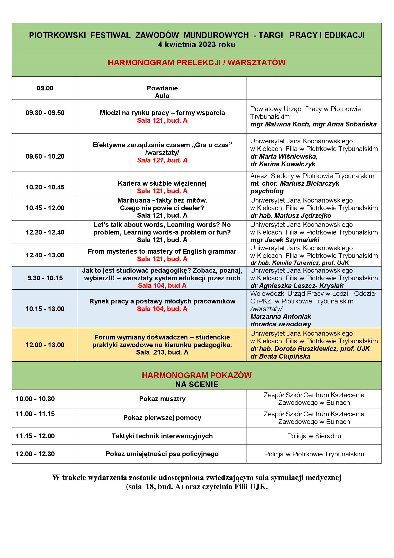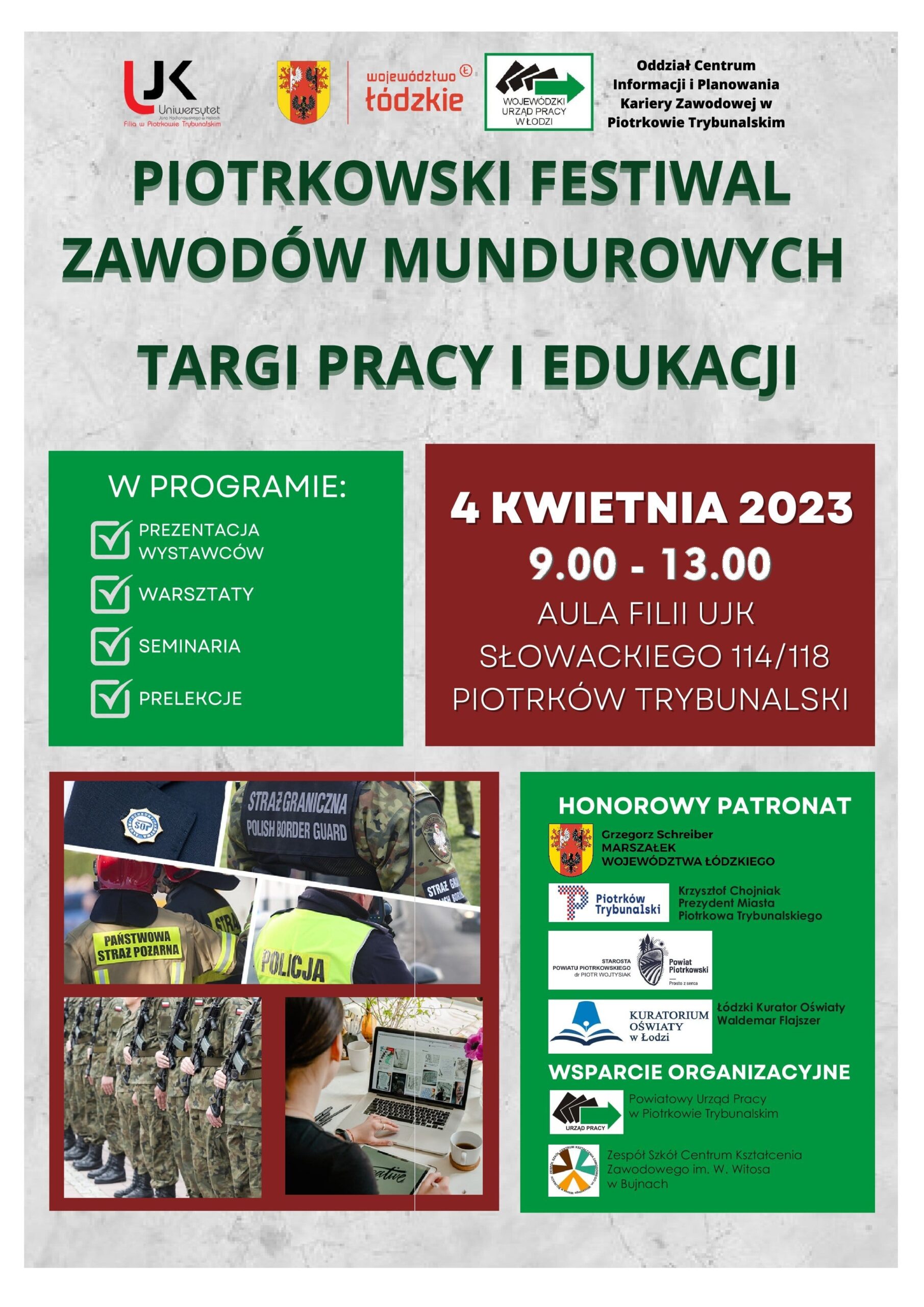 W najbliższy wtorek (04.04) w godzinach 9:00-13:00 odbędzie się w piotrkowskiej filii UJK Festiwal Zawodów Mundurowych – Targi Pracy i Edukacji.