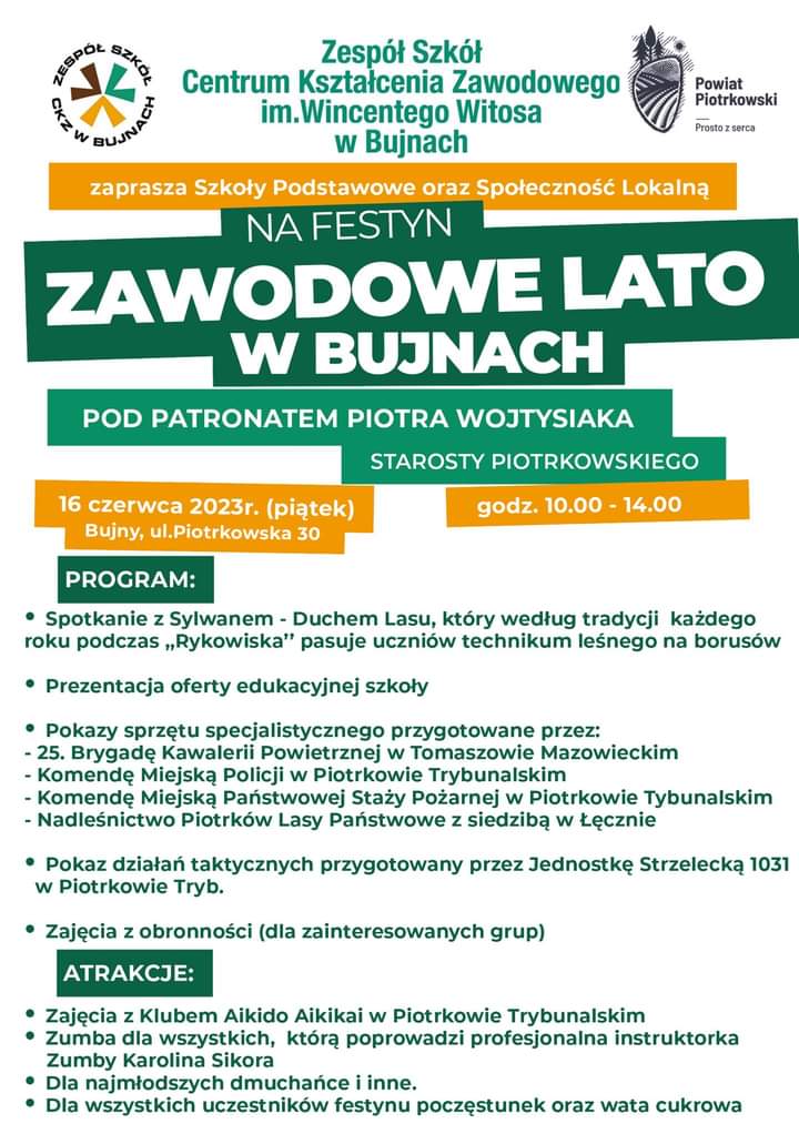 Festyn odbędzie się w najbliższy piątek (16.06) na boisku ZS CKZ w Bujnach, w godzinach od 10:00 do 14:00. W programie między innymi pokazy sprzętu specjalistycznego, przygotowane przez 25 Brygadę Kawalerii Powietrznej w Tomaszowie Mazowieckim, Komendę Miejską Policji w Piotrkowie, Komendę Miejską Państwowej Straży Pożarnej oraz Nadleśnictwo Piotrków. Ponadto zajęcia z klubem aikido, pokazy zumby a także dmuchańce dla dzieci i wata cukrowa.
