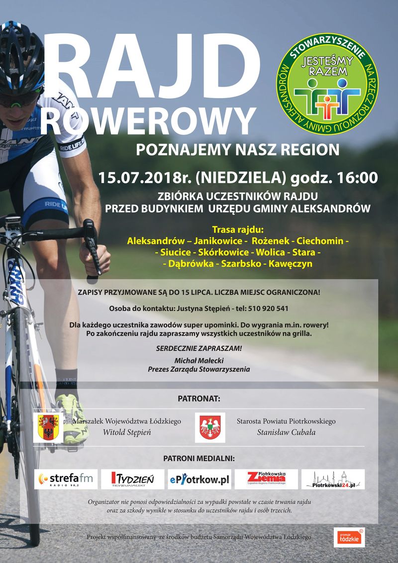 Stowarzyszenie na rzecz rozwoju gminy Aleksandrów „Jesteśmy Razem” zaprasza do wzięcia udziały w kolejnym rajdzie rowerowym. Miłośnicy jazdy na dwóch kółkach będą mieli okazję poznać najpiękniejsze zakątki gminy Aleksandrów, ale nie tylko.