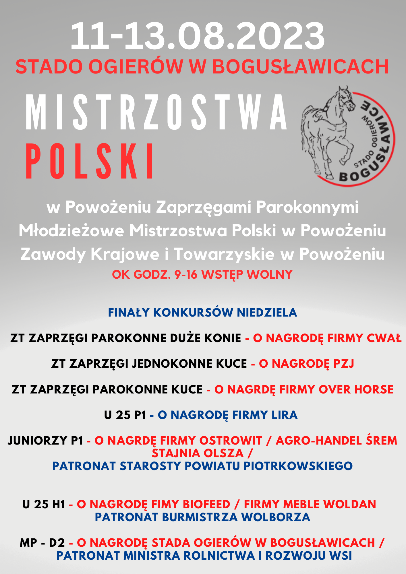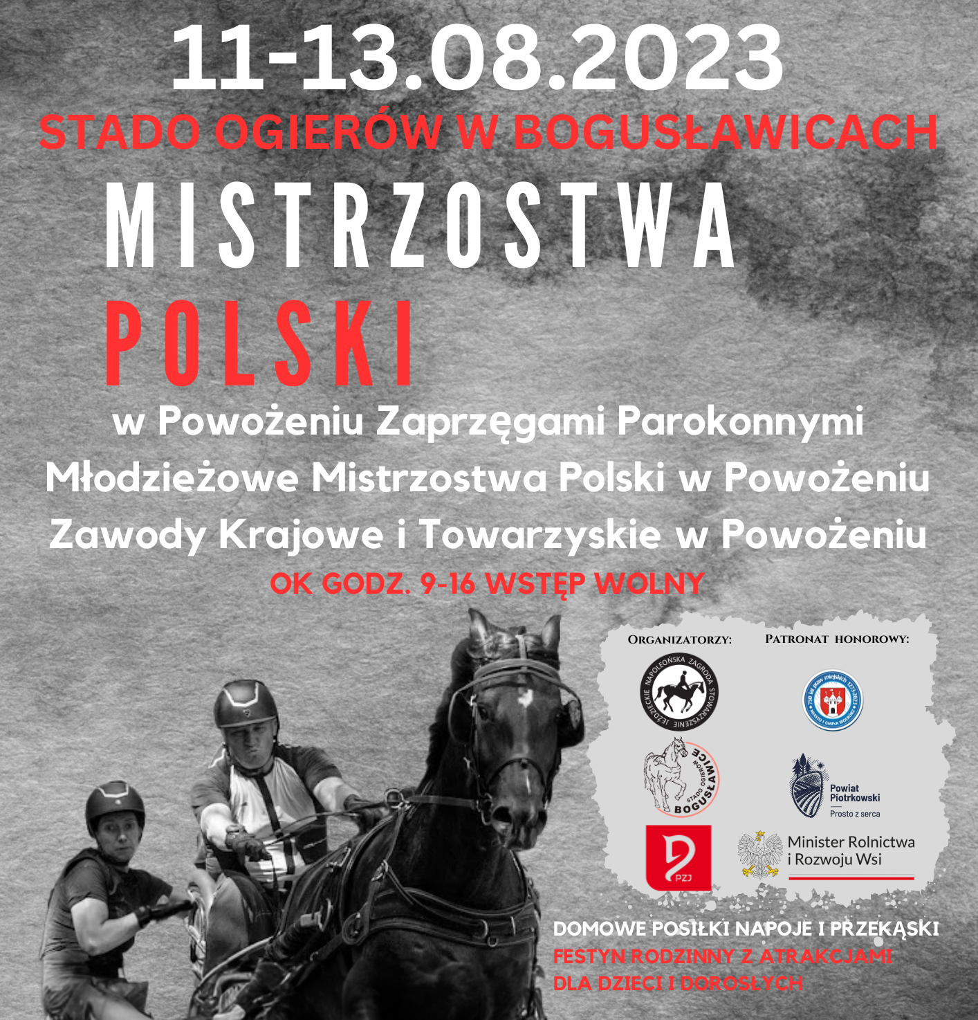 W najbliższy weekend (11-13.08) w Stadzie Ogierów w Bogusławicach odbędą się Mistrzostwa Polski w Powożeniu Zaprzęgami Parokonnym Młodzieżowe Mistrzostwa Polski w Powożeniu Zawody Krajowe i Towarzyskie w Powożeniu Organizatorem wydarzenia jest Stowarzyszenie Jeździeckie Napoleońska Zagroda.