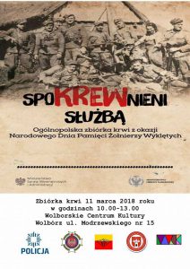 W związku z Narodowym Dniem Pamięci Żołnierzy Wyklętych, w Centrum Kultury w Wolborzu przy ulicy Modrzewskiego 15, zorganizowana będzie zbiórka krwi. – Przyjdźcie, pomóżcie oddajcie najcenniejszą rzecz, jaką można dać drugiemu człowiekowi – mówią organizatorzy. Akcja odbędzie się 11 marca, pomiędzy 10:00 a 13:00.